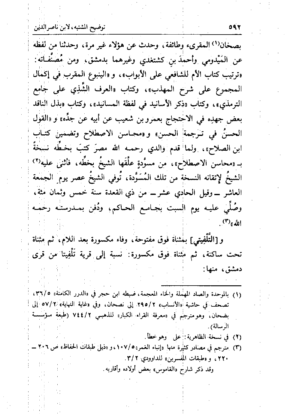 بصخان الْمُقْرِئ وَطَائِفَة وَحدث عَن هَؤُلَاءِ غير مرّة وَحدثنَا من لَفظه عَن الْمَيْدُومِيُّ وَأحمد بن كشتغدي وَغَيرهمَا بِدِمَشْق وَمن مصنفاته: تَرْتِيب كتاب الْأُم للشَّافِعِيّ على الْأَبْوَاب والينبوع المقرب فِي إِكْمَال الْمَجْمُوع على شرح الْمُهَذّب وَكتاب الْعرف الشذي على جَامع التِّرْمِذِيّ وَكتاب ذكر الاسانيد فِي لَفظه المسانيد وَكتاب بذل النَّاقِد بعض جهده فِي الِاحْتِجَاج بِعَمْرو بن شُعَيْب عَن أَبِيه عَن جده وَالْقَوْل الْحسن فِي تَرْجَمَة الْحسن ومحاسن الِاصْطِلَاح وتضمين كتاب ابْن الصّلاح وَلما قدم وَالِدي رَحمَه الله مصر كتب بِخَطِّهِ نُسْخَة بمحاسن الِاصْطِلَاح من مسودة علقها الشَّيْخ بِخَطِّهِ فَأثْنى عَلَيْهِ الشَّيْخ لإتقانه النُّسْخَة من تِلْكَ المسودة توفّي الشَّيْخ عصر يَوْم الْجُمُعَة الْعَاشِر - وَقيل الْحَادِي عشر - من ذِي الْقعدَة سنة خمس وثمان مئة وَصلي عَلَيْهِ يَوْم السبت بِجَامِع الْحَاكِم وَدفن بمدرسته رَحمَه الله و [التلفيتي] بمثناة فَوق مَفْتُوحَة وَفَاء مَكْسُورَة بعد اللَّام ثمَّ مثناة تَحت سَاكِنة ثمَّ مثناة فَوق مَكْسُورَة: نِسْبَة إِلَى قَرْيَة تلفيتا من قرى دمشق مِنْهَا: