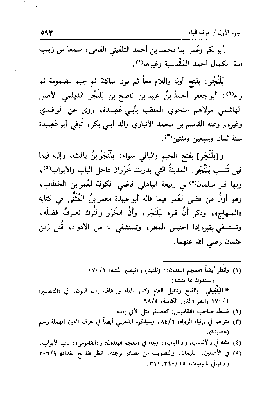 أَبُو بكر وَعمر ابْنا مُحَمَّد بن أَحْمد التلفيتي الفامي سمعا من زَيْنَب ابْنه الْكَمَال أَحْمد المقدسية وَغَيرهَا بلنجر: بِفَتْح أَوله وَاللَّام مَعًا ثمَّ نون سَاكِنة ثمَّ جِيم مَضْمُومَة ثمَّ رَاء: أَبُو جَعْفَر أَحْمد بن عبيد بن نَاصح بن بلنجر الديلمي الأَصْل الْهَاشِمِي مَوْلَاهُم النَّحْوِيّ الملقب بَابي عصيدة روى عَن الْوَاقِدِيّ وَغَيره وَعنهُ الْقَاسِم بن مُحَمَّد الانباري وَالِد أبي بكر توفّي أَبُو عصيدة سنة ثَمَان وَسبعين ومئتين و [بلنجر] بِفَتْح الْجِيم وَالْبَاقِي سَوَاء بلنجر بن يافث وَإِلَيْهِ فِيمَا قيل تنْسب بلنجر: الْمَدِينَة الَّتِي بدربند خزران دَاخل الْبَاب والأبواب وَهُوَ أول من قضى لعمر فِيمَا قَالَه أَبُو عُبَيْدَة معمر بن الْمثنى فِي كِتَابه الْمِنْهَاج وَذكر أَن قَبره ببلنجر وَأَن الخزر وَالتّرْك تعرف فَضله وتستسقي بقبره إِذا احْتبسَ الْمَطَر وتستشفي بِهِ من الادواء قتل زمن عُثْمَان رَضِي الله عَنْهُمَا.