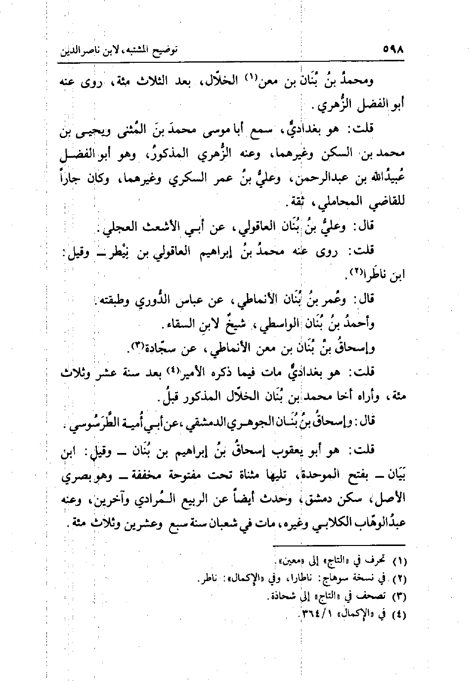 وَمُحَمّد بن بنان بن معن الْخلال بعد الثَّلَاث مئة روى عَنهُ أَبُو الْفضل الزُّهْرِيّ قلت: هُوَ بغدادي سمع أَبَا مُوسَى مُحَمَّد بن الْمثنى وَيحيى بن مُحَمَّد بن السكن وَغَيرهمَا وَعنهُ الزُّهْرِيّ الْمَذْكُور وَهُوَ أَبُو الْفضل عبيد الله بن عبد الرَّحْمَن وَعلي بن عمر السكرِي وَغَيرهمَا وَكَانَ جارا للْقَاضِي الْمحَامِلِي ثِقَة قَالَ: وَعلي بن بنان العاقولي عَن أبي الْأَشْعَث الْعجلِيّ قلت: روى عَنهُ مُحَمَّد بن إِبْرَاهِيم العاقولي بن نيطر - وَقيل: ابْن ناطر قَالَ: وَعمر بن بنان الانماطي عَن عَبَّاس الدوري وطبقته وَاحْمَدْ بن بنان الوَاسِطِيّ شيخ لِابْنِ السقاء وَإِسْحَاق بن بنان بن معن الانماطي عَن سجادة قلت: هُوَ بغدادي مَاتَ فِيمَا ذكره الْأَمِير بعد سنة عشر وَثَلَاث مئة وَأرَاهُ اخا مُحَمَّد بن بنان الْخلال الْمَذْكُور قبل قَالَ: وَإِسْحَاق بن بنان الْجَوْهَرِي الدِّمَشْقِي عَن أبي أُميَّة الطرسوسي قلت: هُوَ أَبُو يَعْقُوب إِسْحَاق بن إِبْرَاهِيم بن بنان - وَقيل: ابْن بَيَان - بِفَتْح الْمُوَحدَة تَلِيهَا مثناة تَحت مَفْتُوحَة مُخَفّفَة - وَهُوَ بَصرِي الاصل سكن دمشق وَحدث أَيْضا عَن الرّبيع الْمرَادِي وَآخَرين وَعنهُ عبد الْوَهَّاب الْكلابِي وَغَيره مَاتَ فِي شعْبَان سنة سبع وَعشْرين وَثَلَاث مئة.