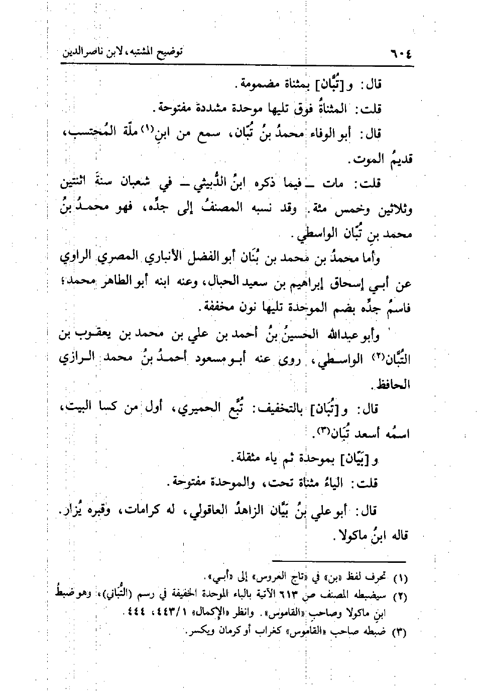 قَالَ: و [تبان] بمثناة مَضْمُومَة قلت: الْمُثَنَّاة فَوق تَلِيهَا مُوَحدَة مُشَدّدَة مَفْتُوحَة قَالَ: أَبُو الْوَفَاء مُحَمَّد بن تبان سمع بن ابْن مِلَّة الْمُحْتَسب قديم الْمَوْت قلت: مَاتَ - فِيمَا ذكره ابْن الدبيثي - فِي شعْبَان سنة اثْنَتَيْنِ وَثَلَاثِينَ وَخمْس مئة وَقد نسبه المُصَنّف إِلَى جده فَهُوَ مُحَمَّد بن مُحَمَّد بن تبان الوَاسِطِيّ وَأما مُحَمَّد بن بن بنان أَبُو الْفضل الانباري الْمصْرِيّ الرَّاوِي عَن أبي إِسْحَاق إِبْرَاهِيم بن سعيد الحبال وَعنهُ ابْنه أَبُو الطَّاهِر مُحَمَّد فاسم جده بِضَم الْمُوَحدَة تَلِيهَا نون مُخَفّفَة وَأَبُو عبد الله الْحُسَيْن بن أَحْمد بن عَليّ بن مُحَمَّد بن يَعْقُوب بن التبَّان الوَاسِطِيّ روى عَنهُ أَبُو مَسْعُود أَحْمد بن مُحَمَّد الرَّازِيّ الْحَافِظ قَالَ: و [تبان] بِالتَّخْفِيفِ: تبع الْحِمْيَرِي أول من كسا الْبَيْت اسْمه اِسْعَدْ تبان و [تبان] بِالتَّخْفِيفِ: تبع الْحِمْيَرِي أول من كسا الْبَيْت اسْمه اِسْعَدْ تبان و [بَيَان] بموحدة ثمَّ يَاء مثقلة قلت: الْيَاء مثناة تَحت وَالْمُوَحَّدَة مَفْتُوحَة قَالَ: أَبُو عَليّ بن بَيَان الزَّاهِد العاقولي لَهُ كرامات وقبره يزار قَالَه ابْن مَاكُولَا.