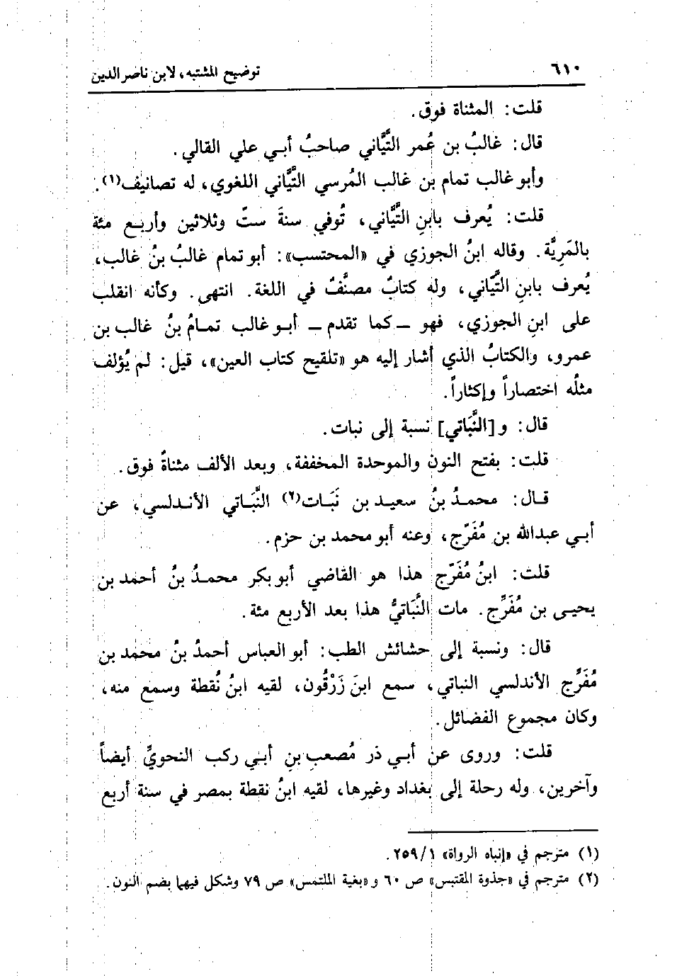 قلت: الْمُثَنَّاة فَوق قَالَ: غَالب بن عمر التياني صَاحب أبي عَليّ القالي وَأَبُو غَالب تَمام بن غَالب المرسي التياني اللّغَوِيّ لَهُ تصانيف قلت: يعرف بِابْن التياني توفّي سنة سِتّ وَثَلَاثِينَ وَأَرْبع مئة بالمرية وَقَالَهُ ابْن الْجَوْزِيّ فِي الْمُحْتَسب: أَبُو تَمام غَالب بن غَالب يعرف بِابْن التياني وَله كتاب مُصَنف فِي اللُّغَة انْتهى وَكَأَنَّهُ انْقَلب على أَبُو الْجَوْزِيّ فَهُوَ - كَمَا تقدم - أَبُو غَالب تَمام بن غَالب بن عَمْرو وَالْكتاب الَّذِي أَشَارَ إِلَيْهِ هُوَ تلقيح كتاب الْعين قيل: لم يؤلف مثله اختصارا وإكثارا قَالَ: و [النباتي] نِسْبَة إِلَى نَبَات قلت: بِفَتْح النُّون وَالْمُوَحَّدَة والمخففة وَبعد الْألف مثناة فَوق قَالَ: مُحَمَّد بن سعيد بن نَبَات النباتي الاندلسي عَن أبي عبد الله بن مفرج وَعنهُ أَبُو مُحَمَّد بن حزم قلت: ابْن مفرج هَذَا هُوَ القَاضِي أَبُو بكر مُحَمَّد بن أَحْمد بن يحيى بن مفرج مَاتَ النباتي هَذَا بعد الْأَرْبَع مئة قَالَ: وَنسبَة إِلَى حشائش الطِّبّ: أَبُو الْعَبَّاس أَحْمد بن مُحَمَّد بن مفرج الأندلسي النباتي سمع أَبُو زرقون لقِيه ابْن نقطة وَسمع مِنْهُ وَكَانَ مَجْمُوع الْفَضَائِل قلت: وروى عَن أبي ذَر مُصعب بن أبي ركب النَّحْوِيّ أَيْضا وَآخَرين وَله رحْلَة إِلَى بَغْدَاد وَغَيرهَا لقِيه ابْن نقطة بِمصْر فِي سنة أَربع