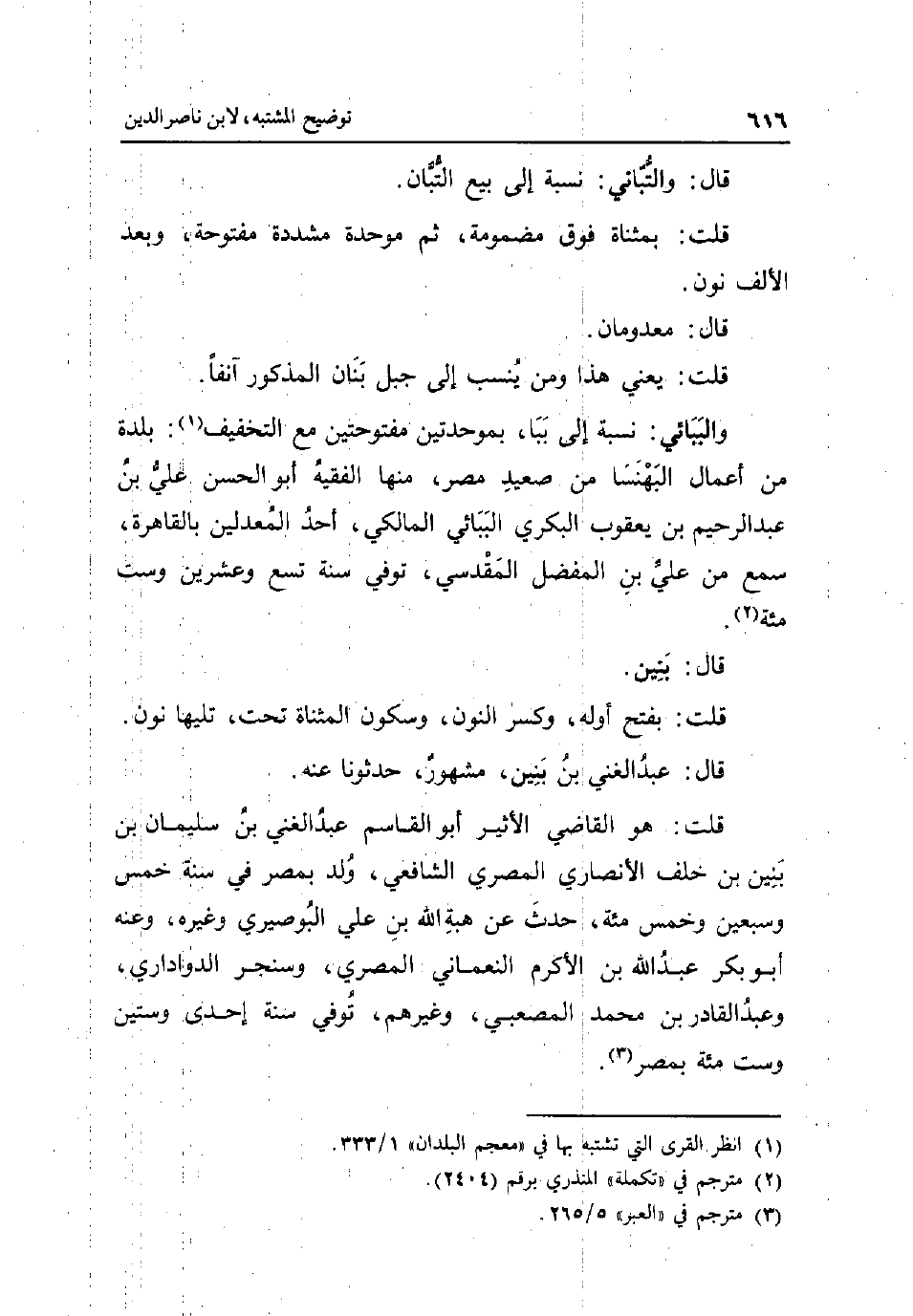 قَالَ: والتباني: نِسْبَة إِلَى بيع التبَّان قلت: بمثناة فَوق مَضْمُومَة ثمَّ مُوَحدَة مُشَدّدَة مَفْتُوحَة وَبعد الْألف نون قَالَ: معدومان قلت: يَعْنِي هَذَا وَمن ينْسب إِلَى جبل بنان الْمَذْكُور آنِفا والببائي: نِسْبَة إِلَى ببا بموحدتين مفتوحتين مَعَ التَّخْفِيف: بَلْدَة من أَعمال البهنسا من صَعِيد مصر مِنْهَا الْفَقِيه أَبُو الْحسن عَليّ بن عبد الرَّحِيم بن يَعْقُوب الْبكْرِيّ الببائي الْمَالِكِي أحد المعدلين بِالْقَاهِرَةِ سمع من عَليّ بن الْمفضل الْمَقْدِسِي توفّي سنة تسع وَعشْرين وست مئة قَالَ: بَنِينَ قلت: بِفَتْح اوله وَكسر النُّون وَسُكُون الْمُثَنَّاة تَحت تَلِيهَا نون قَالَ: عبد الْغَنِيّ بن بَنِينَ مَشْهُور حدثونا عَنهُ قلت: هُوَ القَاضِي الاثير أَبُو الْقَاسِم عبد الْغَنِيّ بن سُلَيْمَان بن بنبن بن خلف الْأنْصَارِيّ الْمصْرِيّ الشَّافِعِي وَالِد بِمصْر فِي سنة خمس وَسبعين وَخمْس مئة حدث عَن هبة الله بن عَليّ البوصيري وَغَيره وَعنهُ أَبُو بكر عبد الله بن الاكرم النعماني الْمصْرِيّ وسنجر الداوداري وَعبد الْقَادِر بن مُحَمَّد المصعبي وَغَيرهم توفّي سنة إِحْدَى وَسِتِّينَ وست مئة بِمصْر.