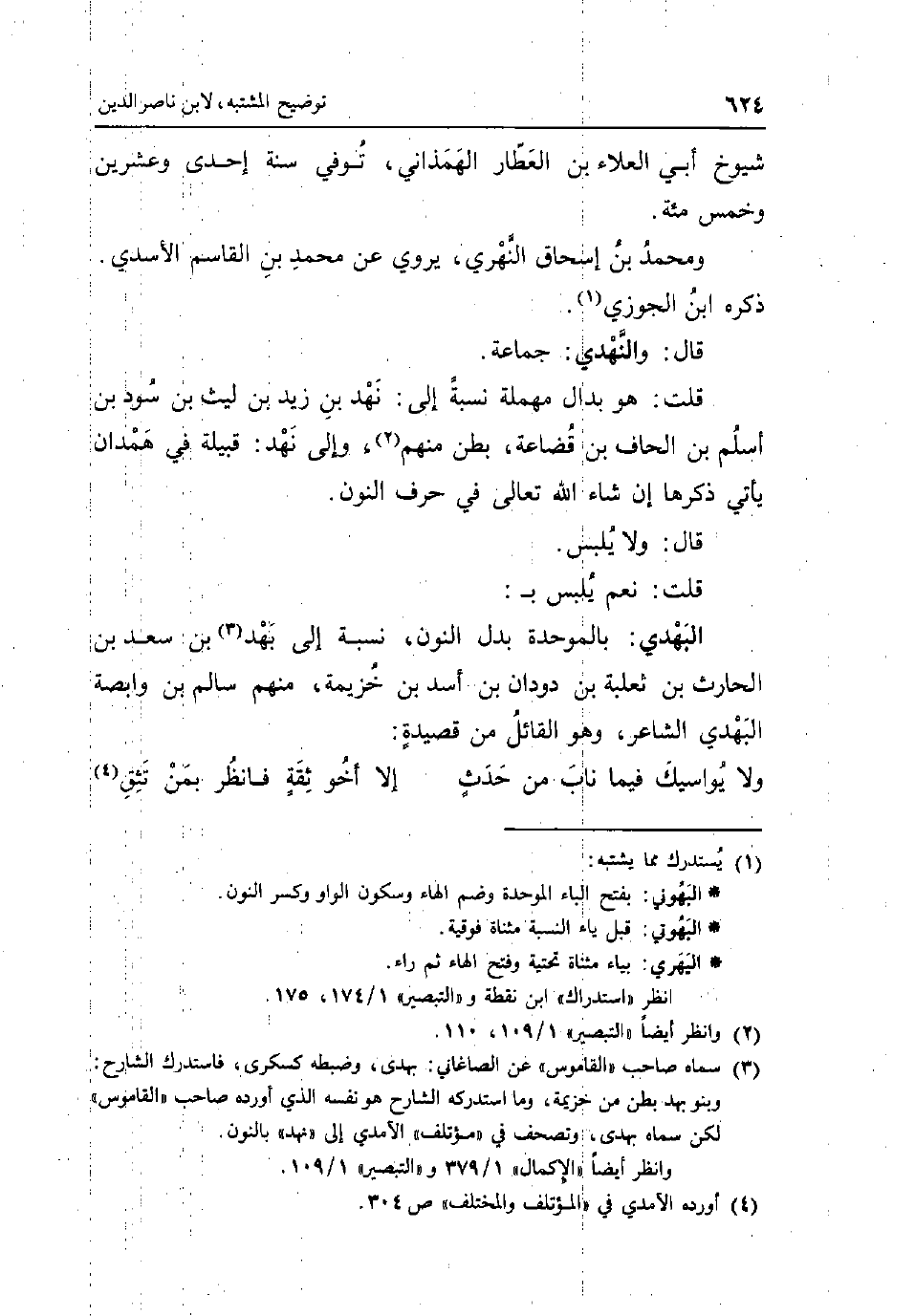 شُيُوخ أبي الْعَلَاء بن الْعَطَّار الهمذاني توفّي سنة إِحْدَى وَعشْرين وَخمْس مئة وَمُحَمّد بن إِسْحَاق النَّهْرِي يروي عَن مُحَمَّد بن الْقَاسِم الاسدي ذكره ابْن الْجَوْزِيّ قَالَ: والنهدي: جمَاعَة قلت: هُوَ بدال مُهْملَة نِسْبَة إِلَى: نهد بن زيد بن لَيْث بن سود بن اسْلَمْ بن الحاف بن قضاعة بطن مِنْهُم وَإِلَى نهد: قَبيلَة فِي هَمدَان يَأْتِي ذكرهَا إِن شَاءَ الله تَعَالَى فِي حرف النُّون قَالَ: وَلَا يلبس قلت: نعم يلبس ب: البهدي: بِالْمُوَحَّدَةِ بدل النُّون نِسْبَة إِلَى بهد بن سعد بن الْحَارِث بن ثَعْلَبَة بن دودان بن أَسد بن خُزَيْمَة مِنْهُم سَالم بن وابصة البهدي الشَّاعِر وَهُوَ الْقَائِل من قصيدة: