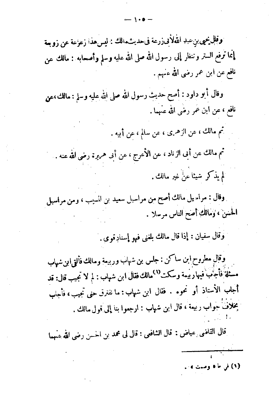 وقال أبو داود: أصح حديث رسول الله صلى الله عليه وسلم مالك عن نافع عن بن عمر رضى الله عنهما ثم مالك عن الزهري عن سالم عن أبيه. ثم مالك عن أبي الزناد عن الأعرج عن أبي هريرة رضي الله عنه لم يذكر شيئاً عن غير مالك. وقال: مراسيل مالك أصح من مراسيل سعيد بن المسيب ومن مراسيل الحسن ومالك أصح الناس مرسلاً. وقال سفيان: إذا قال مالك بلغني فهو إسناد قوي. وقال مطروح بن ساكن: جلس بن شهاب وربيعة ومالك فألقى بن شهاب مسألة فأجاب فيها ربيعة وسكت مالك فقال بن شهاب: لم لا تجيب قال: قد أجاب الأستاذ أو نحوه فقال بن شهاب: ما نفترق حتى تجيب فأجاب بخلاف جواب ربيعة قال بن شهاب: ارجعوا بنا إلى قول مالك.