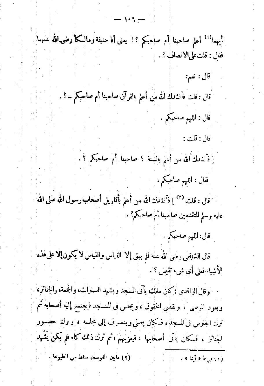أيهما أعلم صاحبنا أم صاحبكم؟ يعني أبا حنيفة ومالكاً رضى الله عنهما فقال: قلت على الإنصاف قال: نعم قال: قلت فأنشدك الله من أعلم بالقرآن صاحبنا أم صاحبكم؟ قال: اللهم صاحبكم. قال: قلت: فأنشدك الله من أعلم بأقاويل أصحاب رسول الله صلى الله عليه وسلم المتقدمين صاحبنا أم صاحبكم؟ قال: اللهم صاحبكم. قال الشافعي رضي الله عنه فلم يبق إلا القياس والقياس لا يكون إلا على هذه الأشياء فعلى أي شيء نقيس؟.