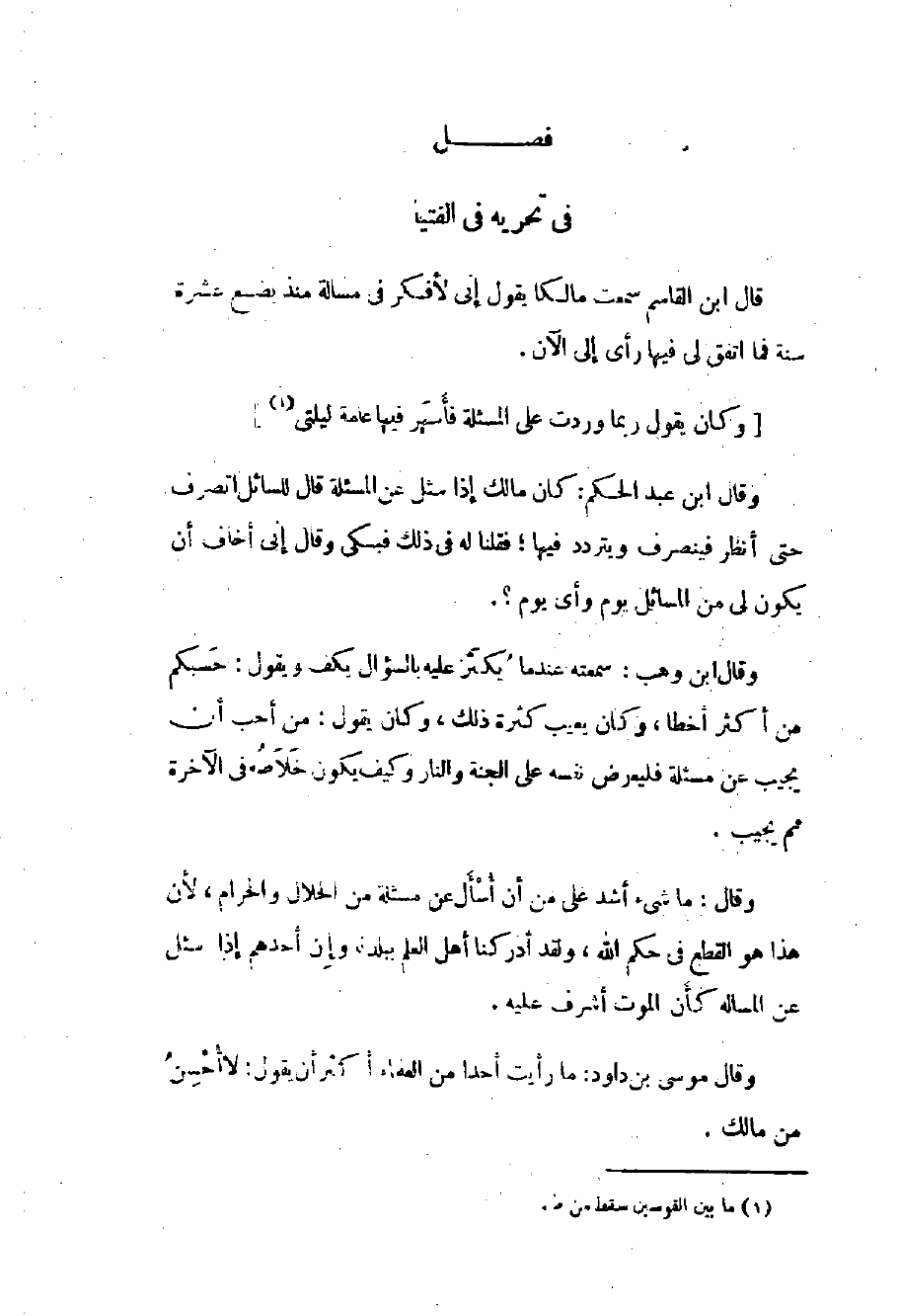 قال بن القاسم سمعت مالكاً يقول: إني لأفكر في مسألة منذ بضع عشرة سنة فما اتفق لي فيها رأي إلى الآن. وكان يقول ربما وردت علي المسألة فأسهر فيها عامة ليلتي.