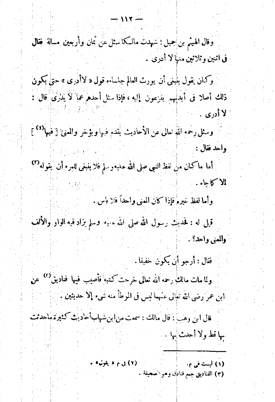 قيل له: فحديث رسول الله صلى الله عليه وسلم يزاد فيه الواو والألف والمعنى واحد؟ فقال: أرجو أن يكون خفيفاً. ولما مات مالك رحمه الله تعالى خرجت كتبه فأصيب فيها فناديق عن بن عمر رضى الله تعالى عنهما ليس في الموطأ منه شيء إلا حديثين.