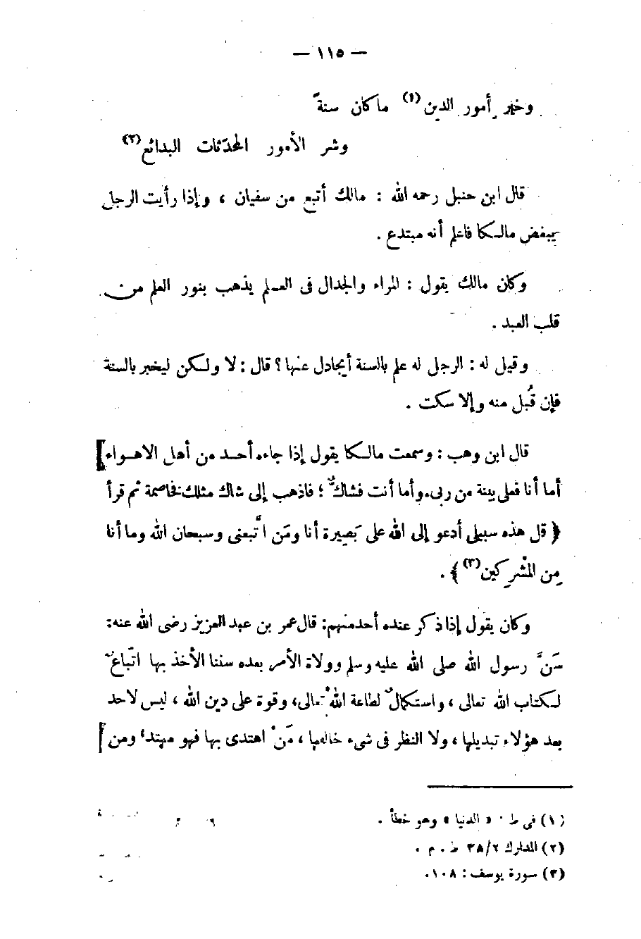 وكان يقول إذا ذكر عنده أحد منهم: قال عمر بن عبد العزيز رضي الله عنه: سن رسول الله صلى الله عليه وسلم وولاة الأمر بعده سنناً الأخذ بها اتباع لكتاب الله تعالى واستكمال لطاعة الله تعالى وقوة على دين الله ليس لأحد بعد هؤلاء تبديلها ولا النظر في شيء خالفها من اهتدى بها فهو مهتد ومن