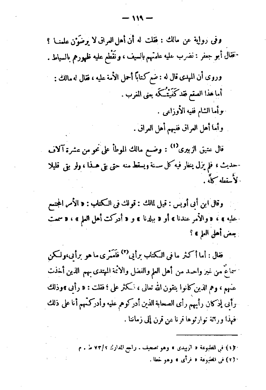 وفي رواية عن مالك: فقلت له أن أهل العراق لا يرضون علمنا؟ فقال أبو جعفر: نضرب عليه عامتهم بالسيف ونقطع عليه ظهورهم بالسياط. وروي أن المهدي قال له: ضع كتاباً أحمل الأمة عليه فقال له مالك: أما هذا الصقع فقد كفيتكه يعني المغرب. وأما الشام ففيه الأوزاعي. وأما أهل العراق ففيهم أهل العراق.