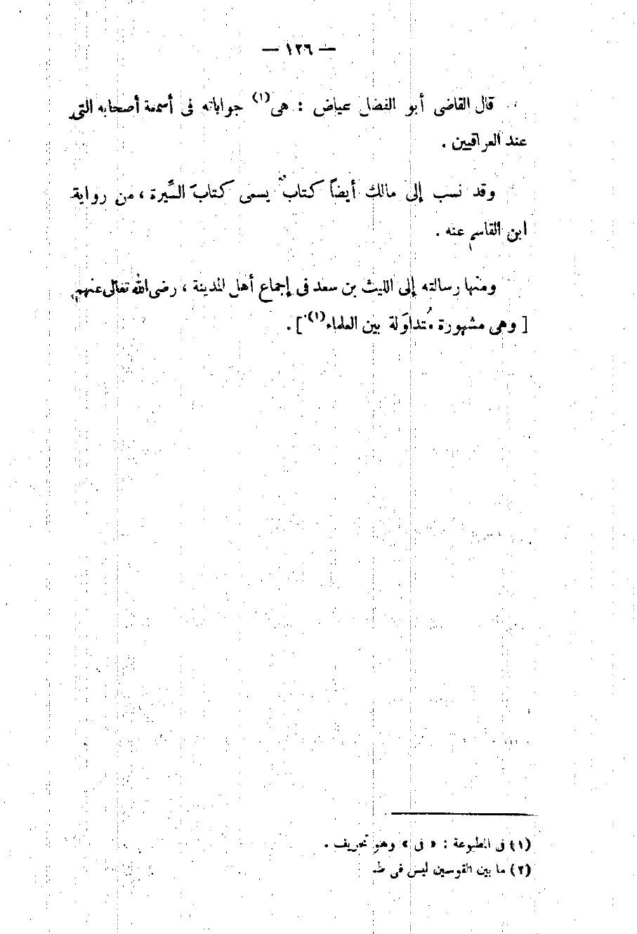 قال القاضي أبو الفضل عياض: هي جواباته في أسمعة أصحابه التي عند العراقيين. وقد نسب إلى مالك أيضاً كتاب يسمى كتاب السيرة من رواية بن القاسم عنه. ومنها رسالته إلى الليث بن سعد في إجماع أهل المدينة رضي الله تعالى عنهم وهي مشهورة متداولة بين العلماء.