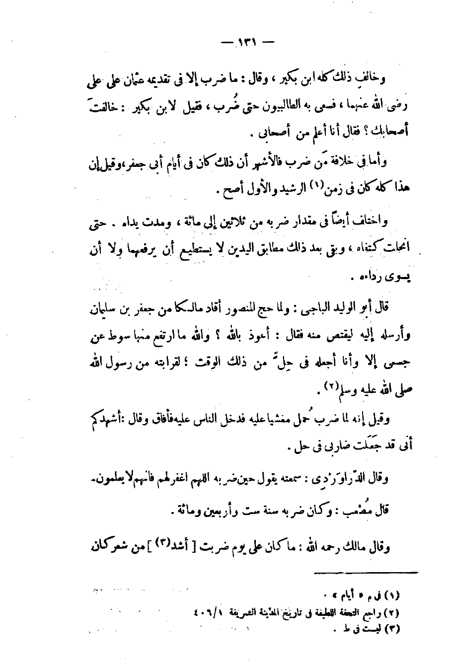 وخالف ذلك كله بن بكير وقال: ما ضرب إلا في تقديمه عثمان على علي رضي الله عنهما فسعى به الطالبيون حتى ضرب فقيل لابن بكير: خالفت أصحابك؟ فقال أنا أعلم من أصحابي. وأما في خلافة من ضرب فالأشهر أن ذلك كان في أيام أبي جعفر وقيل إن هذا كله كان في أيام الرشيد والأول أصح. واختلف أيضاً في مقدار ضربه من ثلاثين إلى مائة ومدت يداه حتى انحلت كتفاه وبقي بعد ذلك مطابق اليدين لا يستطيع أن يرفعهما ولا أن يسوي رداءه.