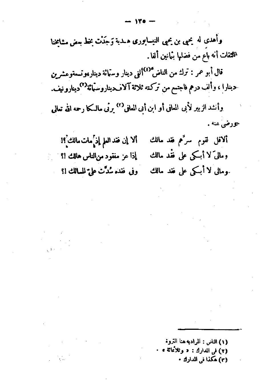 ألا قل لقوم سرهم فقد مالك ... ألا إن فقد العلم إذ مات مالك
