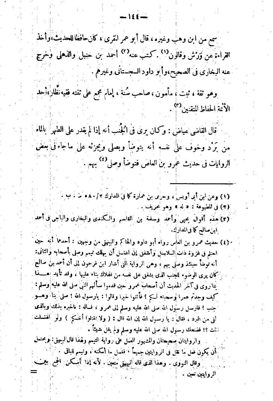 قال القاضي عياض: وكان يرى في الجنب أنه إذا لم يقدر على الطهر بالماء من برد وخوف على نفسه أنه يتوضأ ويصلي ويجزئه على ما جاء في بعض الروايات في حديث عمرو بن العاص فتوضأ وصلى بهم.