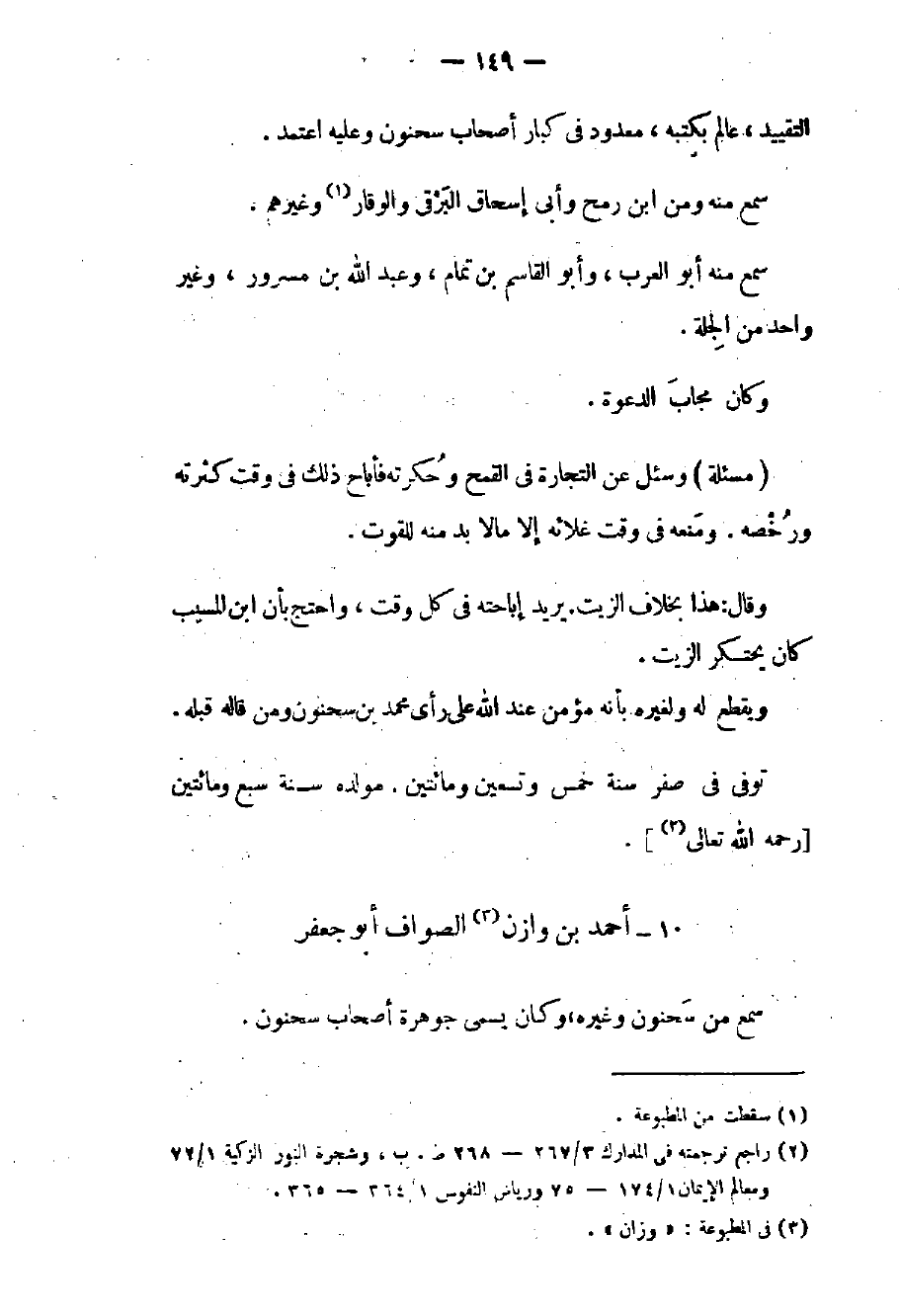 التقييد عالم بكتبه معدود في كبار أصحاب سحنون وعليه اعتمد. سمع منه ومن بن رمح وأبي إسحاق البرقي والوقار وغيرهم. سمع منه أبو العرب وأبو القاسم بن تمام وعبد الله بن مسرور وغير واحد من الجلة. وكان مجاب الدعوة. مسألة: وسئل عن التجارة في القمح وحكرته فأباح ذلك في وقت كثرته ورخصه ومنعه في وقت غلائه إلا ما لا بد منه للقوت. وقال: هذا بخلاف الزيت. يريد إباحته في كل وقت واحتج بأن بن المسيب كان يحتكر الزيت. ويقطع له ولغيره بأنه مؤمن عند الله على رأي محمد بن سحنون ومن قاله قبله. توفي في صفر سنة خمس وتسعين ومائتين. مولده سنة سبع ومائتين رحمه الله تعالى.