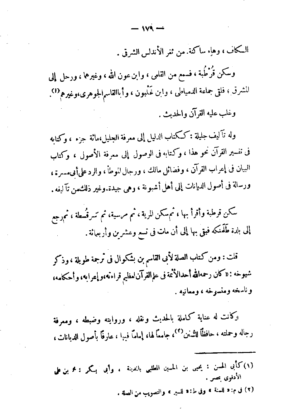 قلت: ومن كتاب الصلة لأبي القاسم بن بشكوال في ترجمة طويلة وذكر شيوخه: كان رحمه الله أحد الأئمة في علم القرآن لعظيم قراءته وإعرابه وأحكامه وناسخه ومنسوخه ومعانيه وكانت له عناية كاملة بالحديث ونقله وروايته وضبطه ومعرفة رجاله وحملته حافظاً للسنن جامعاً لها إماماً فيها عارفاً بأصول الديانات