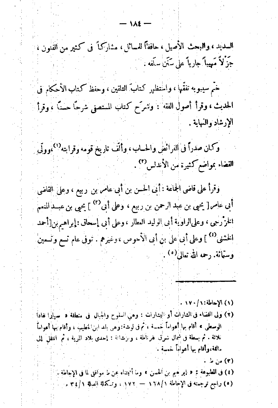 السديد والبحث الأصيل حافظاً للمسائل مشاركاً في كثير من الفنون جزلاً مهيباً جارياً على سنن سلفه. ختم سيبويه تفقهاً واستظهر كتاب التلقين وحفظ كتاب الأحكام في الحديث وقرأ أصول الفقه: وشرح كتاب المستصفى شرحاً حسناً وقرأ الإرشاد والنهاية. وكان صدراً في الفرائض والحساب وألف تاريخ قومه وقرابته وولي القضاء بمواضع كثيرة من الأندلس.