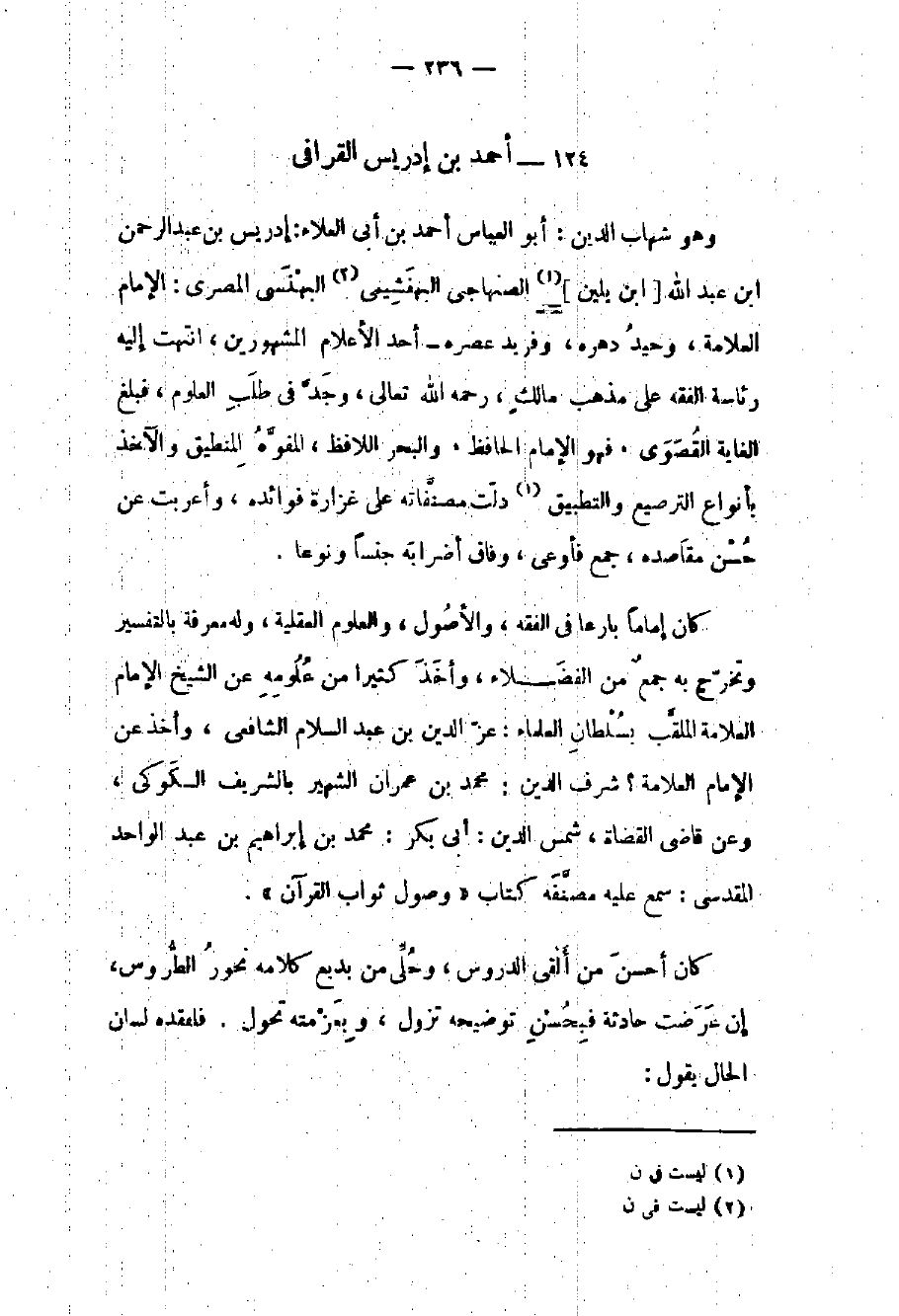 وهو شهاب الدين: أبو العباس أحمد بن أبي العلاء: إدريس بن عبد الرحمن بن عبد الله بن يلين الصنهاجي البهفشيمي البهنسي المصري: الإمام العلامة وحيد دهره وفريد عصره - أحد الأعلام المشهورين انتهت إليه رئاسة الفقه على مذهب مالك رحمه الله تعالى وجد في طلب العلوم فبلغ الغاية القصوى فهو الإمام الحافظ والبحر اللافظ المفوه المنطيق والآخذ بأنواع الترصيع والتطبيق دلت مصنفاته على غزارة فوائده وأعربت عن حسن مقاصده جمع فأوعى وفاق أضرابه جنساً ونوعاً.