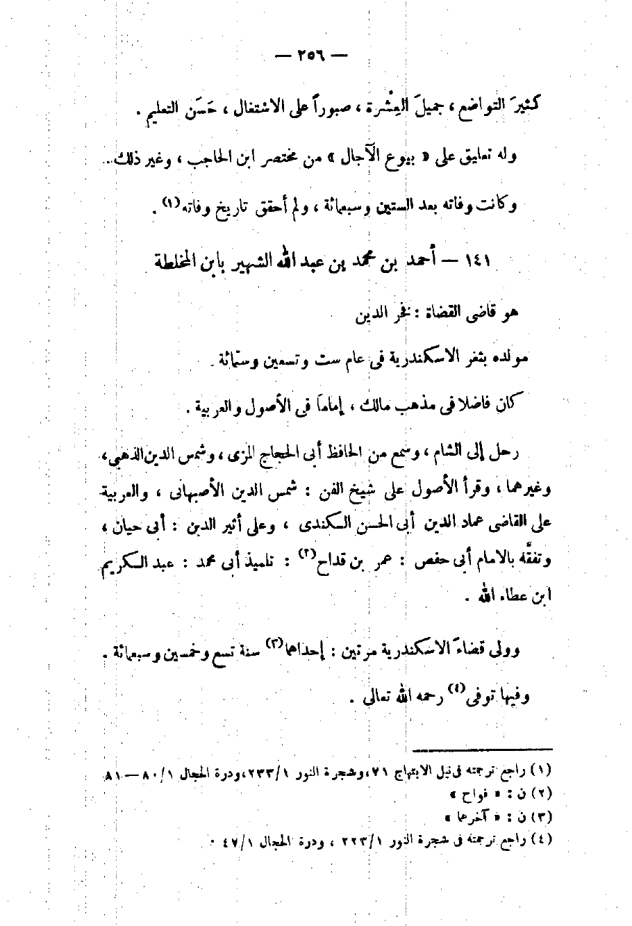 هو قاضي القضاة: فخر الدين مولده بثغر الإسكندرية في عام ست وتسعين وستمائة. كان فاضلاً في مذهب مالك إماماً في الأصول والعربية.