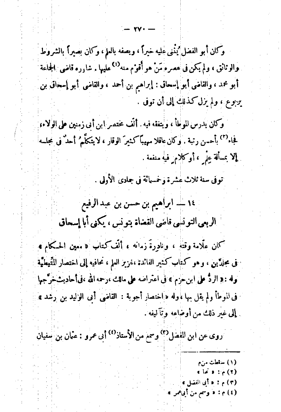 قاضي القضاة بتونس يكنى أبا إسحاق كان علامة وقته ونادرة زمانه ألف كتاب معين الحكام في مجلدين وهو كتاب كثير الفائدة غزير العلم نحا فيه إلى اختصار المتيطية وله: الرد على بن حزم في اعتراضه على مالك رحمه الله في أحاديث خرجها في الموطأ ولم يقل بها وله اختصار أجوبة: القاضي أبي الوليد بن رشد إلى غير ذلك من أوضاعه وتآليفه.