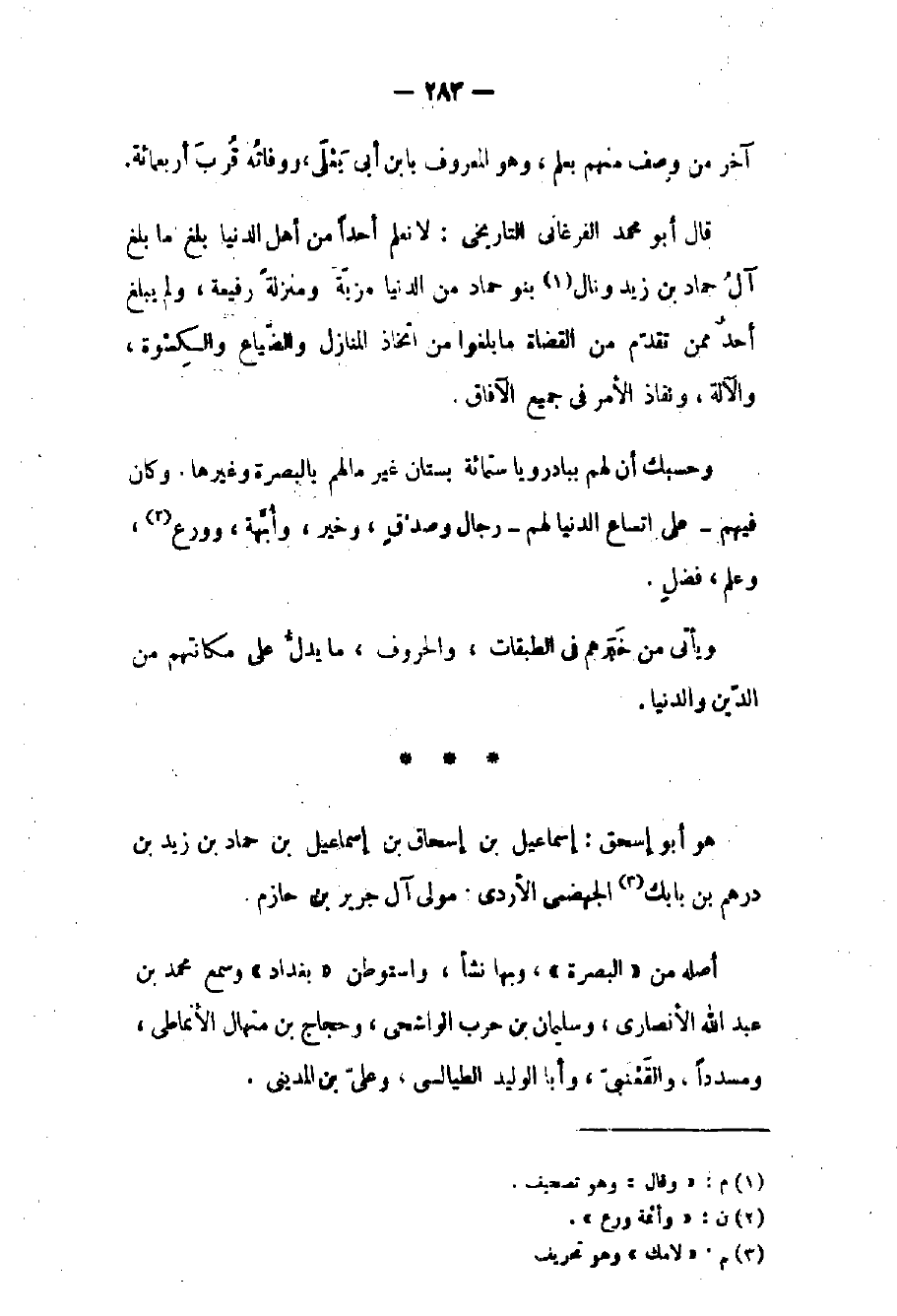 هو أبو إسحاق: إسماعيل بن إسحاق بن إسماعيل بن حماد بن زيد بن درهم بن بابك الجهضمي الأزدي: مولى آل جرير بن حازم أصله من البصرة بها نشأ واستوطن بغداد وسمع محمد بن عبد الله الأنصاري وسليمان بن حرب الواشحي وحجاج بن منهال الأنماطي ومسدداً والقعنبي وأبا الوليد الطيالسي وعلي بن المديني.