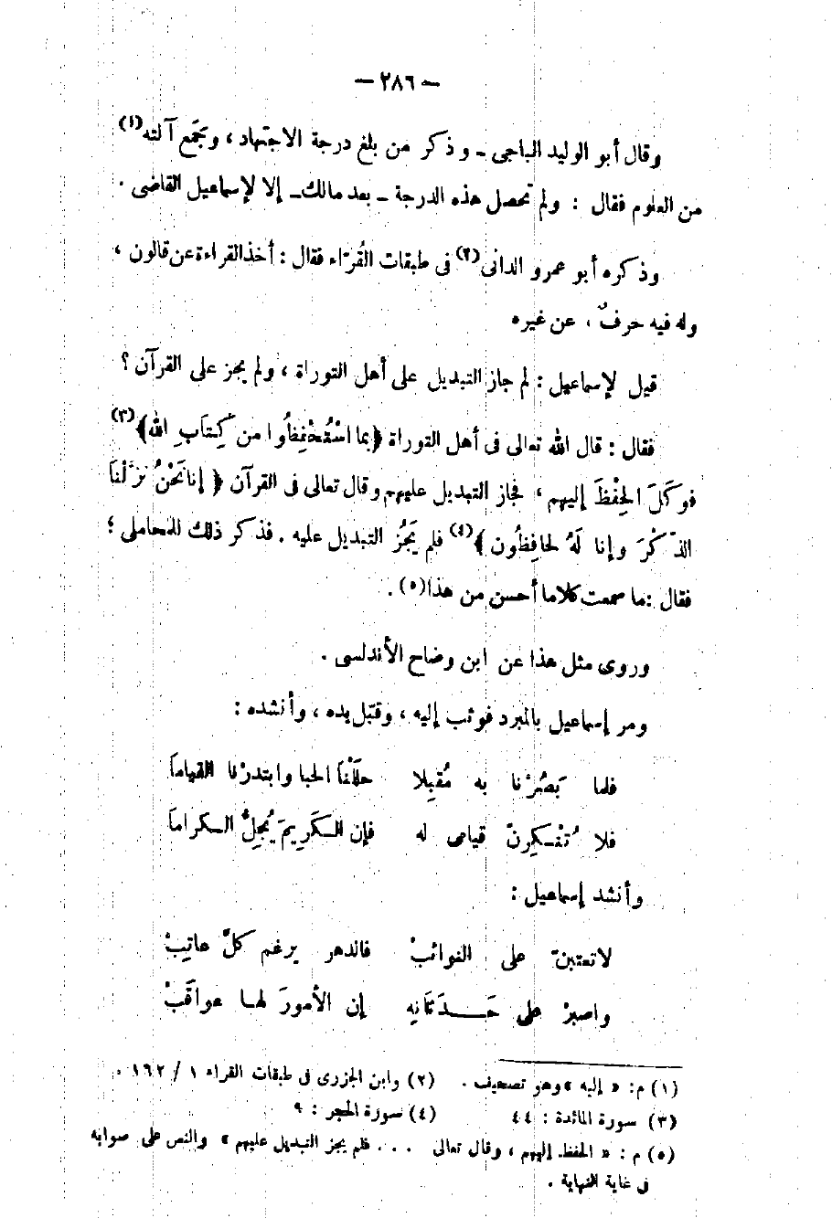 وذكره أبو عمر الداني في طبقات القراء فقال: أخذ القراءة عن قالون وله فيه حرف عن غيره قيل لإسماعيل: لم جاز التبديل على أهل التوارة ولم يجز على القرآن؟ فقال: قال الله تعالى في أهل التوارة: " بما استحفظوا من كتاب الله " المائدة: 44 فوكل الحفظ إليهم فجاز التبديل عليهم وقال تعالى في القرآن: " إنا نحن نزلنا الذكر وإنا له لحافظون " الحجر: 9 فلم يجز التبديل عليه. فذكر ذلك للمحاملي فقال: ما سمعت كلاماً أحسن من هذا وروي مثل هذا عن بن وضاح الأندلسي ومر إسماعيل بالمبرد فوثب إليه وقبل يده وأنشده: