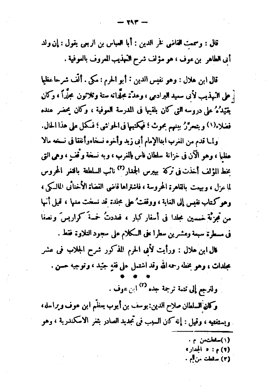 قال بن هلال: ورأيت لأبي الحرم المذكور شرح الجلاب في عشر مجلدات وهو بخطه رحمه الله وقد اشتمل على فقه جيد وتوجيه حسن. ولنرجع إلى تتمة ترجمة جده بن عوف.