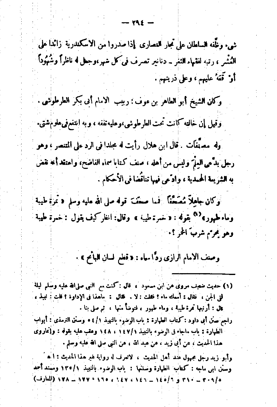 وكان الشيخ أبو الطاهر بن عوف ربيب الإمام أبي بكر الطرطوشي وقيل إن خالته كانت تحت الطرطوشي وعليه تفقه وبه انتفع في علوم شتى وله مصنفات قال بن هلال: رأيت له مجلداً في الرد على المنتصر وهو رجل يدعي العلم وليس من أهله صنف كتاباً سماه الفاضح واعتقد أنه نقض به الشريعة المحمدية وادعى فيها تناقضاً في الأحكام وكان جاهلاً مصحفاً فما صحف قوله صلى الله عليه وسلم: " تمرة طيبة وماء طهور " بقوله: " خمرة طيبة " وقال: انظر كيف يقول: خمرة طيبة وهو يحرم شرب الخمر؟. وصنف الإمام الرازي رداً سماه: قطع لسان البائح.