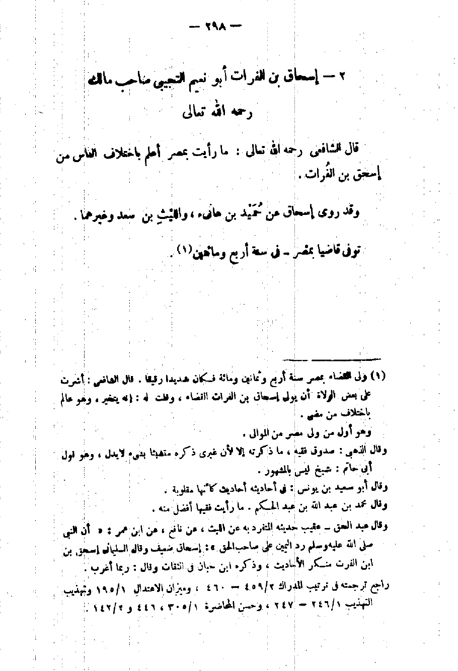 صاحب مالك رحمه الله تعالى قال الشافعي رحمه الله تعالى: ما رأيت بمصر أعلم باختلاف الناس من إسحاق بن الفرات وقد روى إسحاق عن حميد بن هانئ والليث بن سعد وغيرهما توفي قاضياً بمصر - في سنة أربع ومائتين.