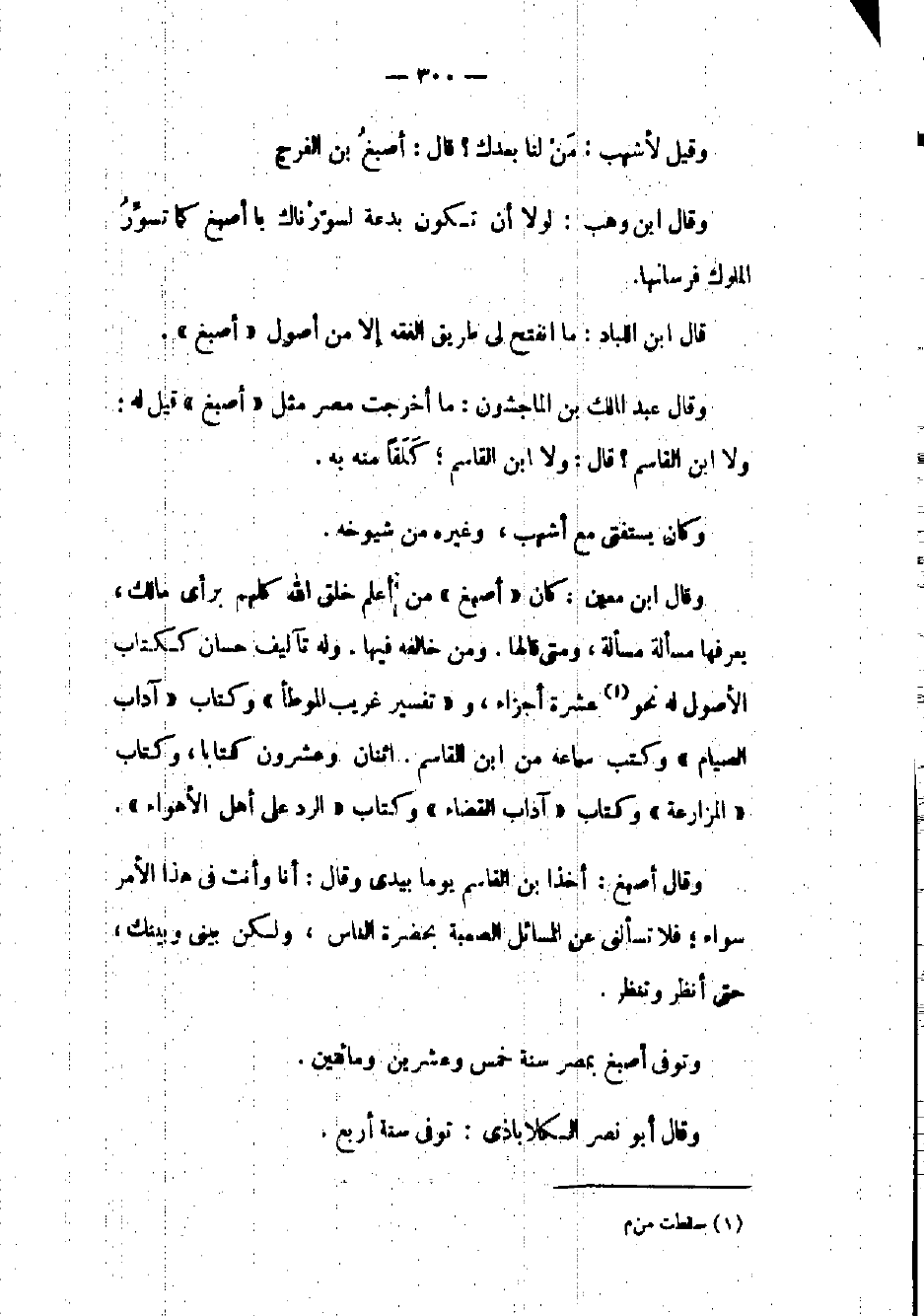 وقال بن معين: كان أصبغ من أعلم خلق الله كلهم برأي مالك يعرفها مسألة مسألة ومتى قالها ومن خالفه فيها وله تآليف حسان ككتاب الأصول له عشرة أجزاء وتفسير غريب الموطأ وكتاب آداب الصيام وكتب سماعه من بن القاسم. اثنان وعشرون كتاباً وكتاب المزارعة وكتاب آداب القضاء وكتاب الرد على أهل الأهواء.