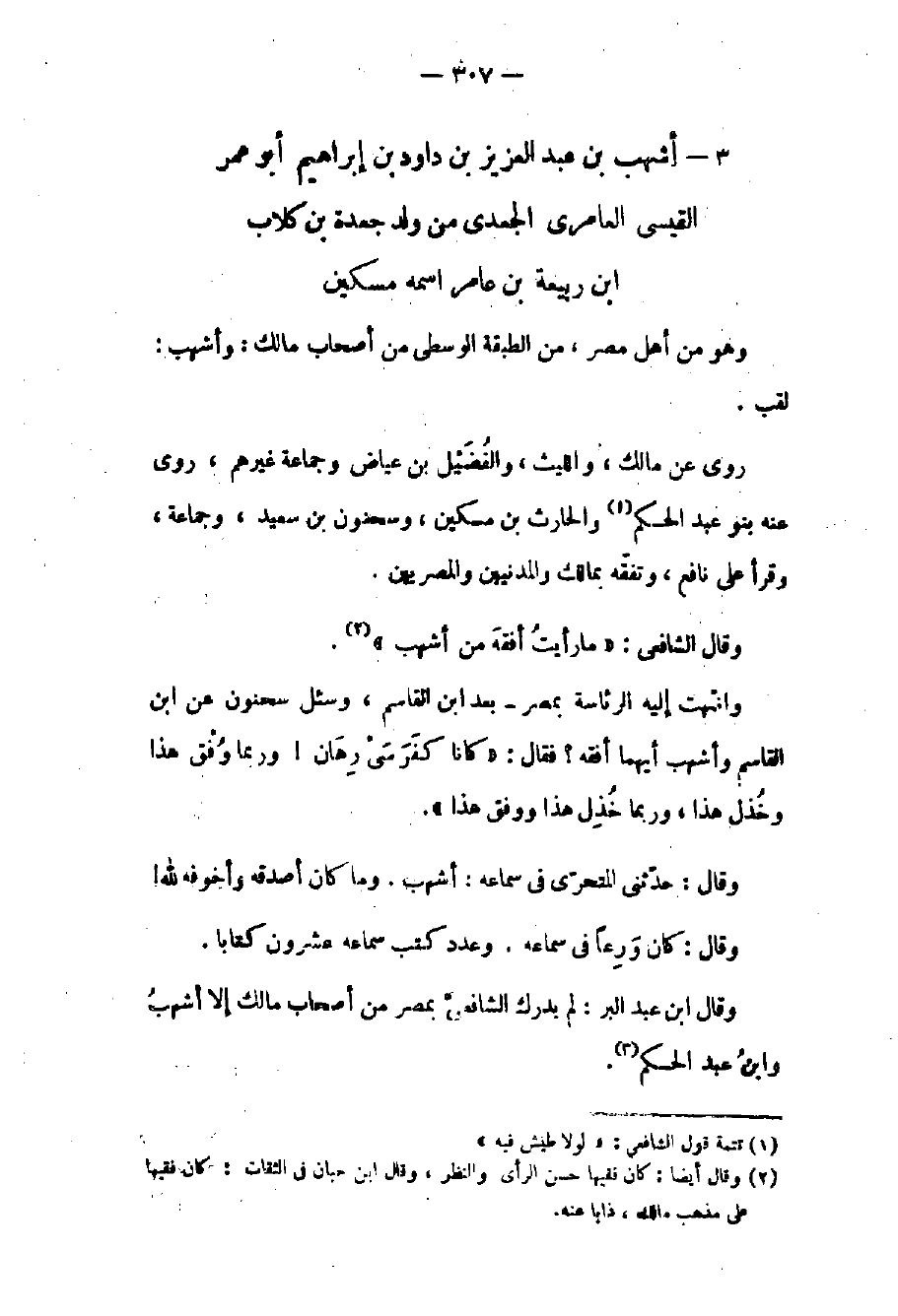 وانتهت إليه الرئاسة بمصر - بعد بن القاسم وسئل سحنون عن بن القاسم وأشهب أيهما أفقه؟ فقال: كانا كفرسي رهان وربما وفق هذا وخذل هذا وربما خذل هذا ووفق هذا. وقال: حدثني المتحري في سماعه: أشهب. وما كان أصدقه وأخوفه لله وقال: كان ورعاً في سماعه وعدد كتب سماعه عشرون كتاباً وقال بن عبد البر: لم يدرك الشافعي بمصر من أصحاب مالك إلا أشهب وابن عبد الحكم