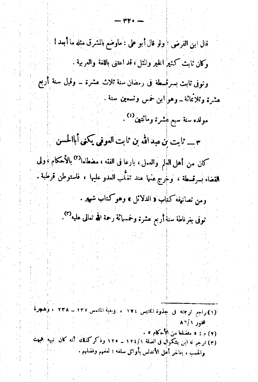 قال بن الفرضي: ولو قال أبو علي: ما وضع بالمشرق مثله ما أبعد وكان ثابت كثير الخير والمثل قد اعتنى باللغة والعربية. وتوفي ثابت بسرقسطة في رمضان سنة ثلاث عشرة - وقيل سنة أربع عشرة وثلاثمائة - وهو بن خمس وتسعين سنة مولده سنة تسع عشرة ومائتين.