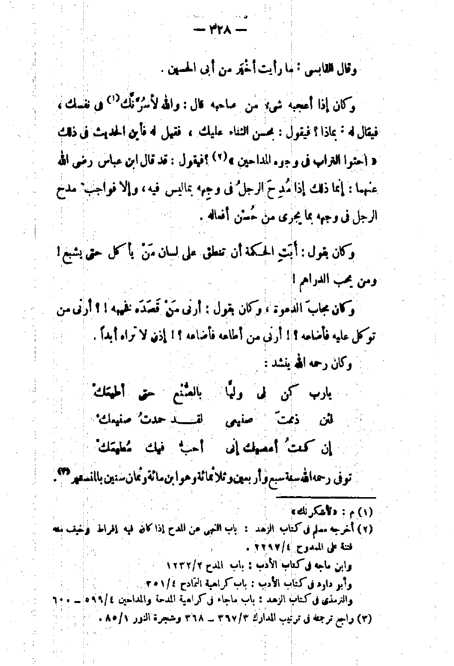 وقال القابسي: ما رأيت أخير من أبي الحسين وكان إذا أعجبه شيء من صاحبه قال: والله لأسرنك في نفسك فيقال له: بماذا؟ فيقول: بحسن الثناء عليك فقيل له فأين الحديث في ذلك احثوا التراب في وجوه المداحين؟ فيقول: قد قال بن عباس رضي الله عنهما: إنما ذلك إذا مدح الرجل في وجهه بما ليس فيه وإلا فواجب مدح الرجل في وجهه بما يجري من حسن أفعاله. وكان يقول: أبت الحكمة أن تنطق على لسان من يأكل حتى يشبع ومن يحب الدارهم وكان مجاب الدعوة وكان يقول: أرني من قصده فخيبه؟ أرني من توكل عليه فأضاعه؟ أرني من أطاعه فأضاعه؟ إذن لا تراه أبداً. وكان رحمه الله ينشد: