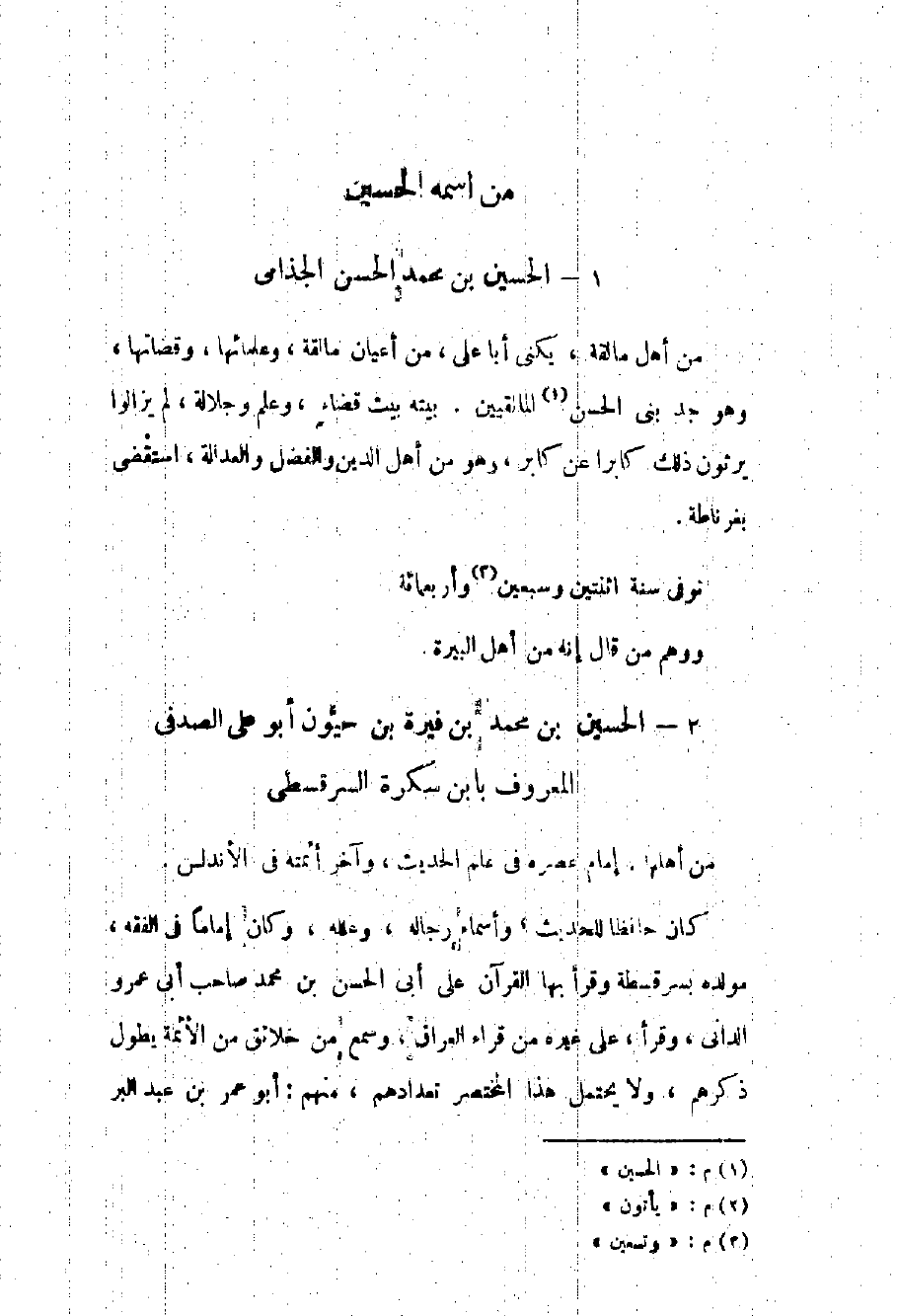 من أهل مالقة يكنى أبا علي من أعيان مالقة وعلمائها وقضاتها وهو حد بني الحسين المالقيين بيته بيت قضاء وعلم وجلالة لم يزالوا يأتون ذلك كابراً عن كابر وهو من أهل الدين والفضل والعدالة استقضي بغرناطة توفي سنة اثنين وسبعين وأربعمائة ووهم من قال إنه من أهل البيرة.