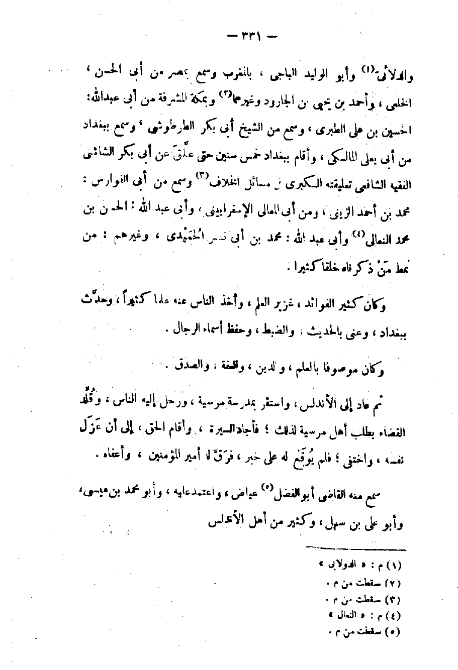 وكان كثير الفوائد غزير العلم وأخذ الناس عنه علماً كثيراً وحدث ببغداد وعني بالحديث والضبط وحفظ أسماء الرجال وكان موصوفاً بالعلم والدين والعفة والصدق ثم عاد إلى الأندلس واستقر بمدرسة مرسية ورحل إليه الناس وقلد القضاء بطلب أهل مرسية لذلك فأجاد السيرة وأقام الحق إلى أن عزل نفسه واختفى فلم يوقع له على خبر فرق له أمير المؤمنين وأعفاه.