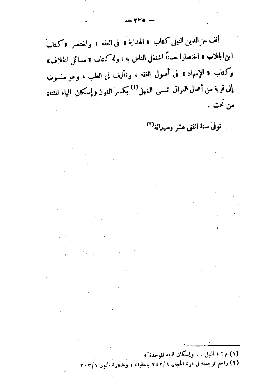 ألف عز الدين النيلي كتاب الهداية في الفقه واختصر كتاب بن الجلاب اختصاراً حسناً اشتغل الناس به وله كتاب مسائل الخلاف وكتاب الإمهاد في أصول الفقه وتأليف في الطب وهو منسوب إلى قرية من أعمال العراق تسمى النيل بكسر النون وإسكان الباء المثناة من تحت توفي سنة اثنتي عشرة وسبعمائة.