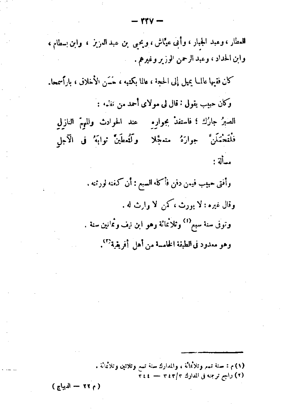 مسألة: وأفتى حبيب فيمن دفن فأكله السبع: أن كفنه لورثته وقال غيره: لا يورث كمن لا وارث له وتوفي سنة سبع وثلاثمائة وهو بن نيف وثمانين سنة وهو معدود في الطبقة الخامسة من أهل أفريقية.