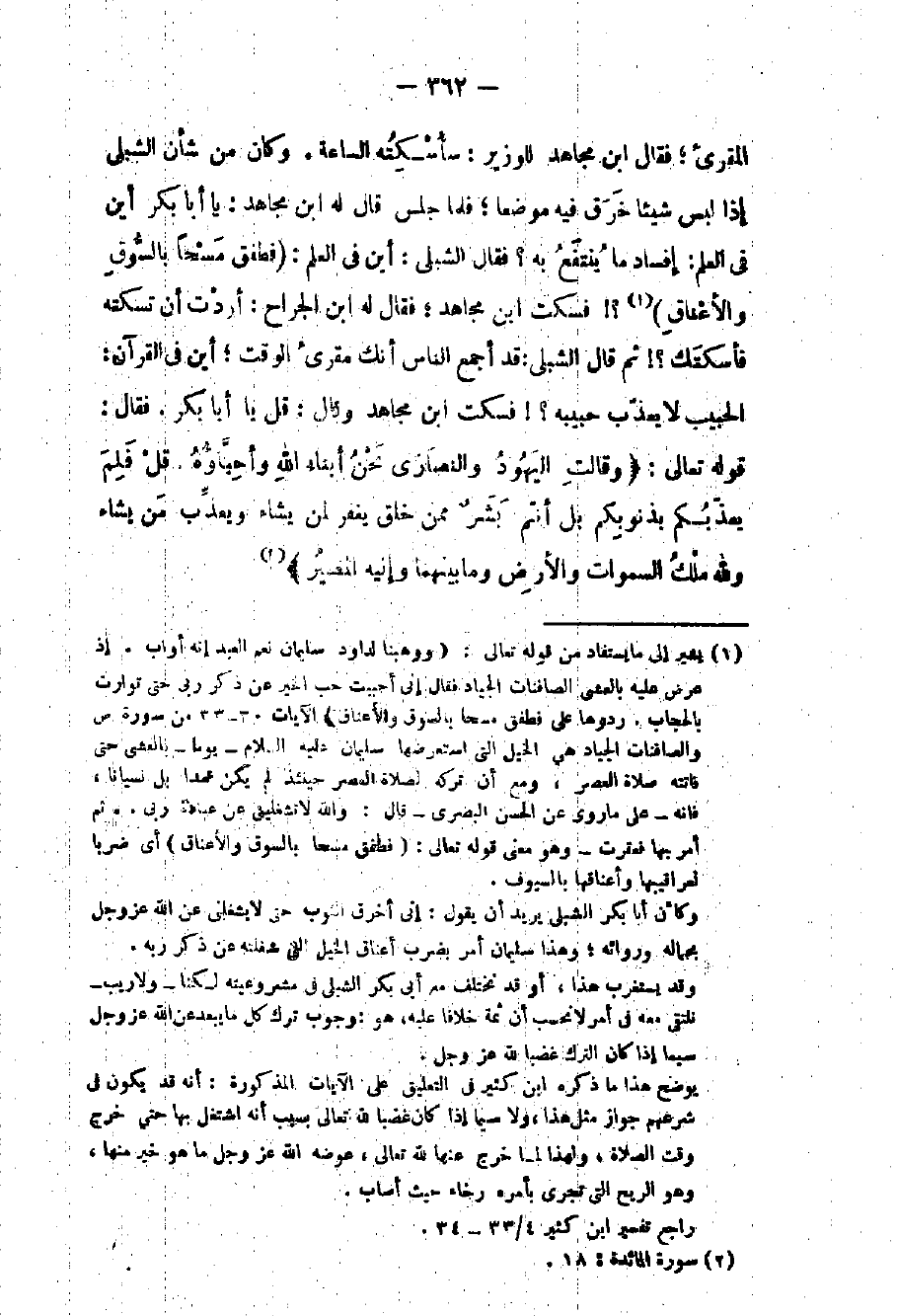 المقرئ فقال بن مجاهد للوزير: سأسكته الساعة وكان من شأن الشبلي إذا لبس شيئاً خرق فيه موضعاً فلما جلس قال له بن مجاهد: يا أبا بكر أين في العلم: إفساد ما ينتفع به؟ فقال الشبلي: أين في العلم: " فطفق مسحاً بالسوق والأعناق "؟ فسكت بن مجاهد فقال له بن الجراح: أردت أن تسكته فأسكتك؟ ثم قال الشبلي: قد أجمع الناس أنك مقرئ الوقت أين في القرآن: الحبيب لا يعذب حبيبه؟ فسكت بن مجاهد وقال: قل يا أبا بكر فقال: قوله تعالى: " وقالت اليهود والنصارى نحن أبناء الله وأحباؤه قل فلم يعذبكم بذنوبكم بل أنتم بشر ممن خلق يغفر لمن يشاء ويعذب من يشاء ولله ملك السموات والأرض وما بينهما وإليه المصير " المائدة: 18.