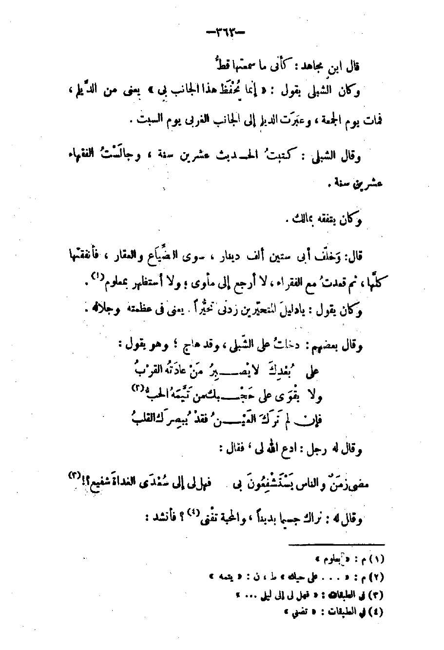 قال: وخلف أبي ستين ألف دينار سوى الضياع والعقار فأنفقتها كلها ثم قعدت مع الفقراء لا أرجع إلى مأوى ولا أستظهر بعلوم وكان يقول: يا دليل المتحيرين زدني تحيراً. يعني في عظمته وجلاله وقال بعضهم: دخلت على الشبلي وقد هاج وهو يقول: