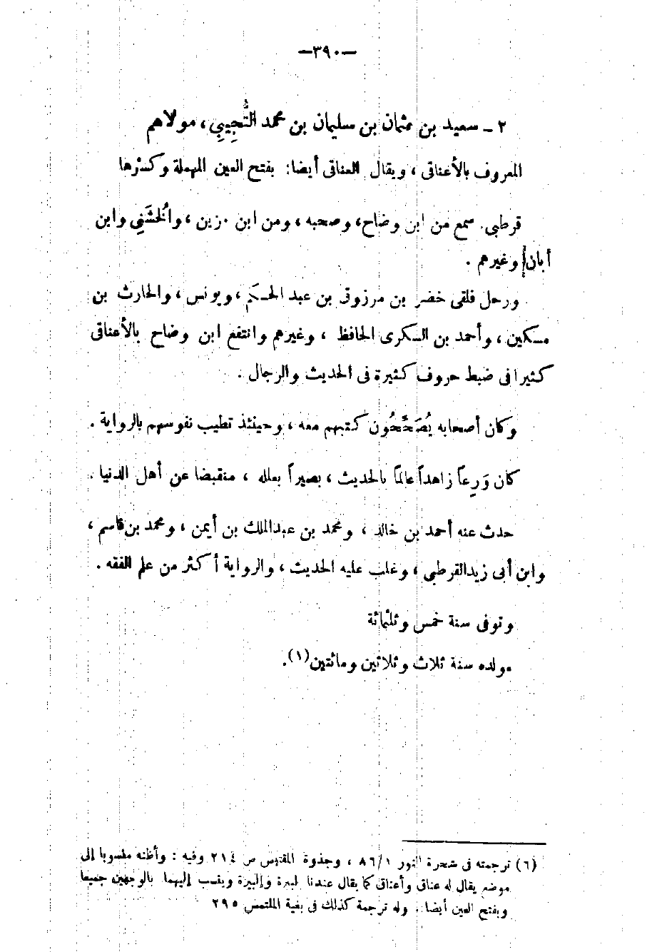 مولاهم المعروف بالأعناقي ويقال العناقي أيضاً: بفتح العين المهملة وكسرها قرطبي سمع من بن وضاح وصحبه ومن بن مزين والخشني وابن أبان وغيرهم ورحل فلقي خضر بن مرزوق بن عبد الحكم ويونس والحارث بن مسكين وأحمد بن صالح وابن السكري الحافظ وغيرهم وانتفع بن وضاح بالأعناقي كثيراً في ضبط حروف كثيرة في الحديث والرجال.