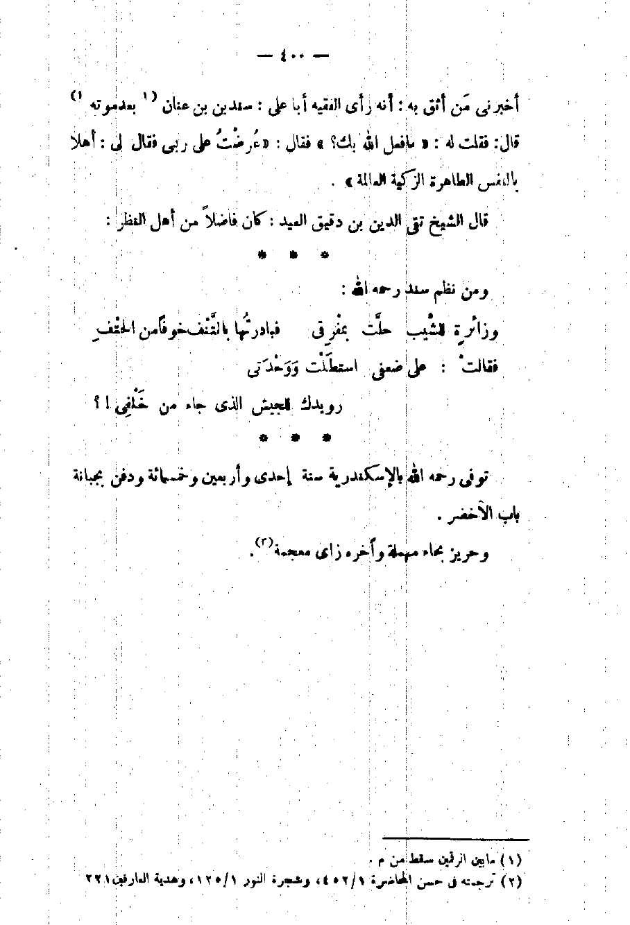 أخبرني من أثق به أنه رأى الفقيه أبا علي: سند بن عنان قال فقلت له: ما فعل الله بك؟ فقال: عرضت على ربي قال لي: أهلا بالنفس الطاهرة الزكية العالمة. قال الشيخ تقي الدين بن دقيق العيد: كان فاضلاً من أهل النظر: ومن نظم سند رحمه الله:
