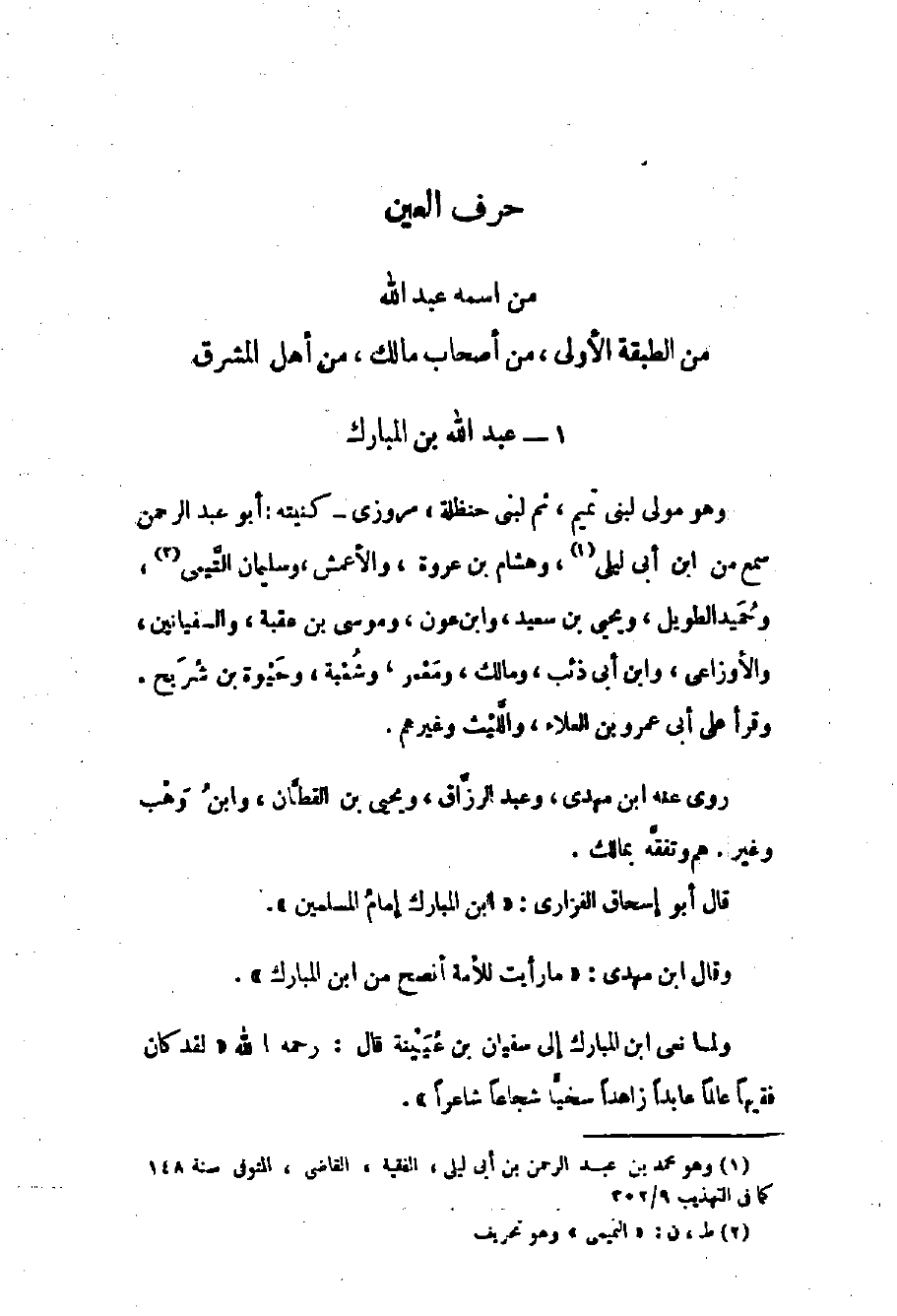 وهو مولى لبني تميم ثم لبني حنظلة مروزي - كنيته: أبو عبد الرحمن سمع من ابن أبي ليلى وهشام بن عروة والأعمش وسليمان التيمي وحميد الطويل ويحيى بن سعيد وابن عون وموسى بن عقبة والسفيانين والأوزاعي وابن أبي ذئب ومالك ومعمر وشعبة وحيوة بن شريح وقرأ على أبي عمرو بن العلاء والليث وغيرهم.