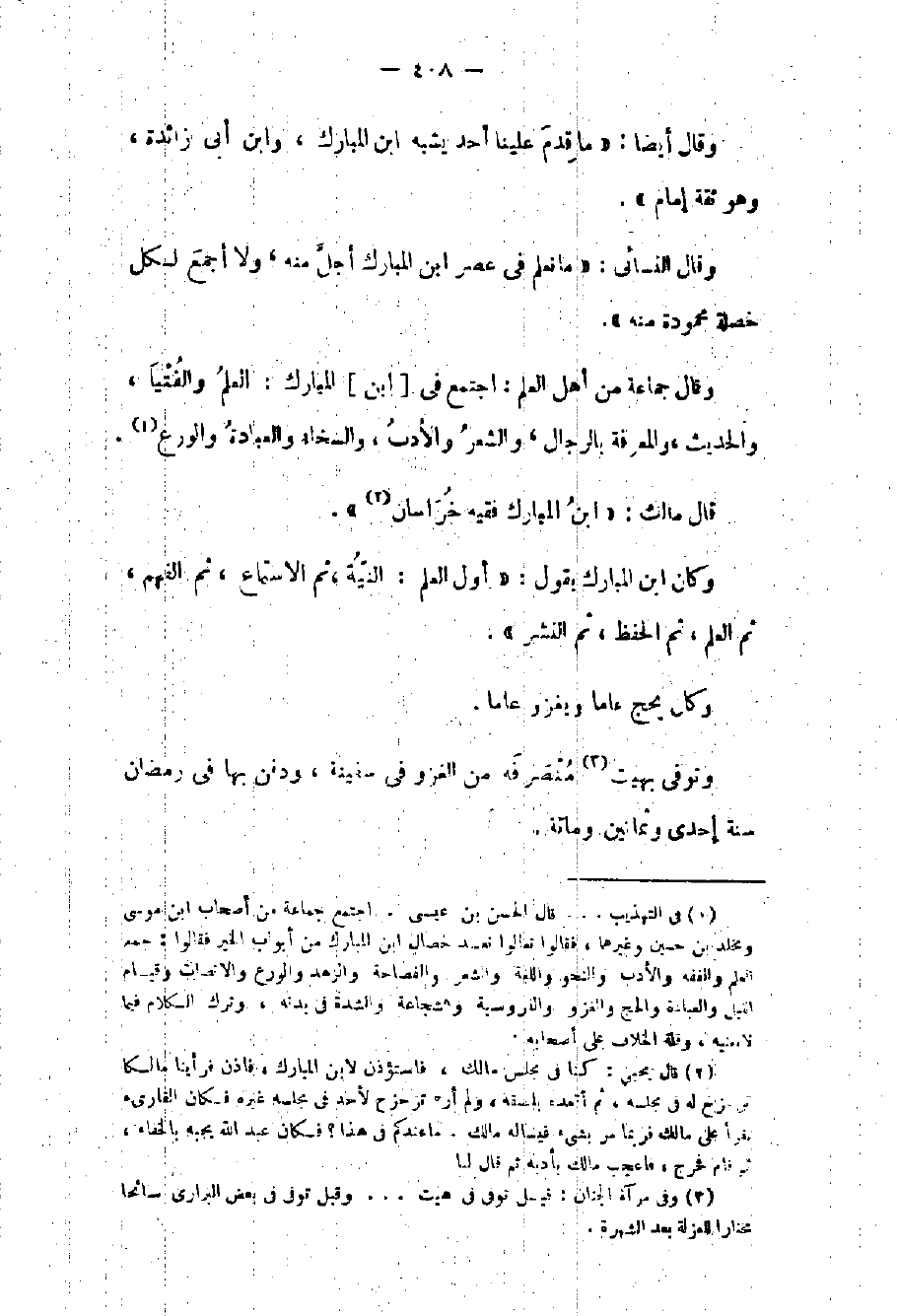وقال جماعة من أهل العلم: اجتمع في ابن المبارك: العلم والفتيا والحديث والمعرفة بالرجال والشعر والأدب والسخاء والعبادة والورع قال مالك: ابن المبارك فقيه خراسان وكان بن المبارك يقول: أول العلم: النية ثم الاستماع ثم الفهم ثم العلم ثم الحفظ ثم النشر وكان يحج عاماً ويغزو عاماً. وتوفي بهيت منصرفه من الغزو في سفينة ودفن بها في رمضان سنة إحدى وثمانين ومائة