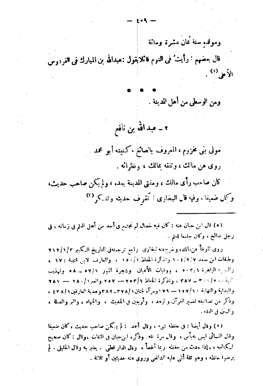 ومولده سنة ثمان عشرة ومائة وقال بعضهم: رأيت في النوم قائلاً يقول: عبد الله بن المبارك في الفردوس الأعلى.