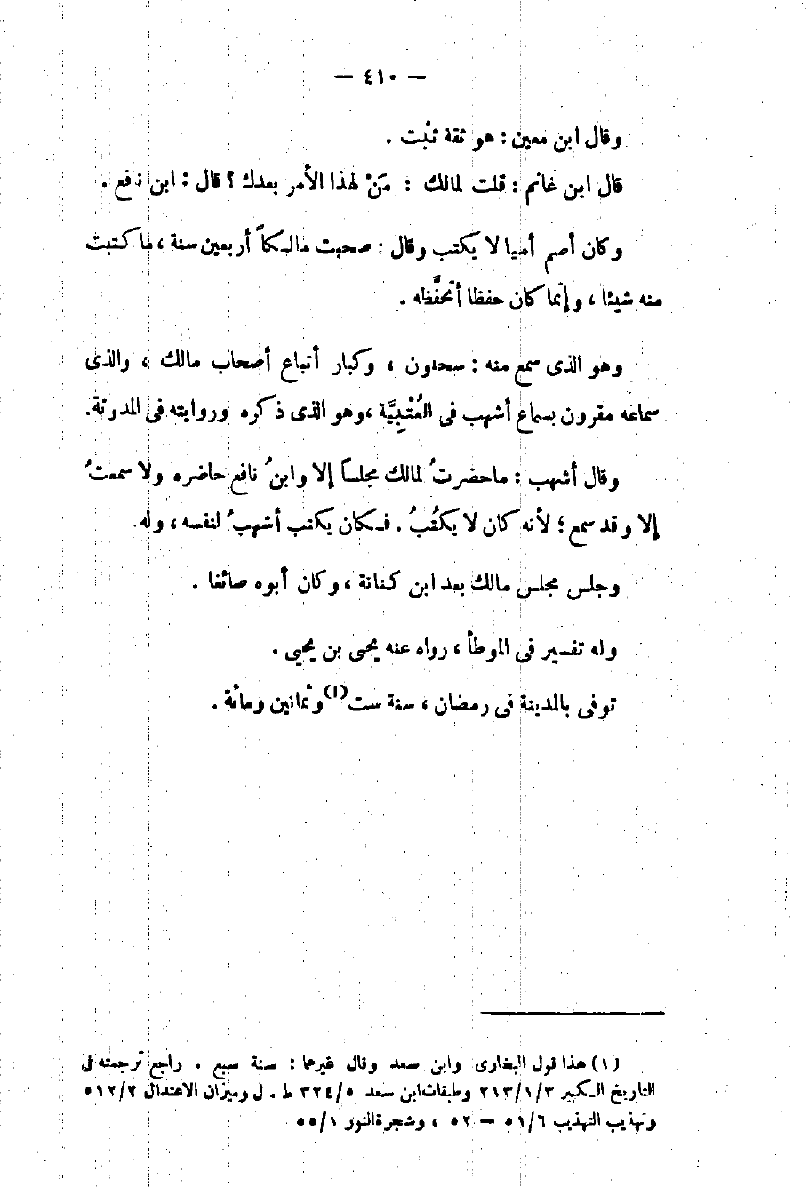 وقال أشهب: ما حضرت لمالك مجلساً إلا وابن نافع حاضره ولا سمعت إلا وقد سمع لأنه كان لا يكتب فكان يكتب أشهب لنفسه وله. وجلس مجلس مالك بعد بن كنانة وكان أبوه صائغاً وله تفسير في الموطأ رواه عنه يحيى بن يحيى. توفي بالمدينة في رمضان سنة ست وثمانين ومائة.