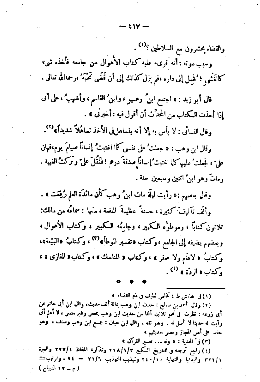 والقضاة يحشرون مع السلاطين؟ وسبب موته: أنه قرئ عليه كتاب الأهوال من جامعه فأخذه شيء كالغشي فحمل إلى داره فلم يزل كذلك إلى أن قضى نحبه رحمه الله تعالى قال أبو زيد: اجتمع بن وهب وابن القاسم وأشهب على أني إذا أخذت الكتاب من المحدث أن أقول فيه: أخبرني.