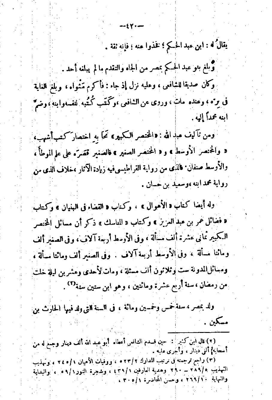 يقال له: بن عبد الحكم فخذوا عنه فإنه ثقة وبلغ بنو عبد الحكم بمصر من الجاه والتقدم ما لم يبلغه أحد وكان صديقاً للشافعي وعليه نزل إذ جاء: فأكرم مثواه وبلغ الغاية في بره وعنده مات وروى عن الشافعي وكتب كتبه لنفسه وابنه وضم ابنه محمداً إليه. ومن تآليف عبد الله: المختصر الكبير نحا به اختصار كتب أشهب والمختصر الأوسط والمختصر الصغير فالصغير قصره على علم الموطأ والأوسط صنفان فالذي من رواية القراطيسي فيه زيادة الآثار خلاف الذي من رواية محمد ابنه وسعيد بن حسان.