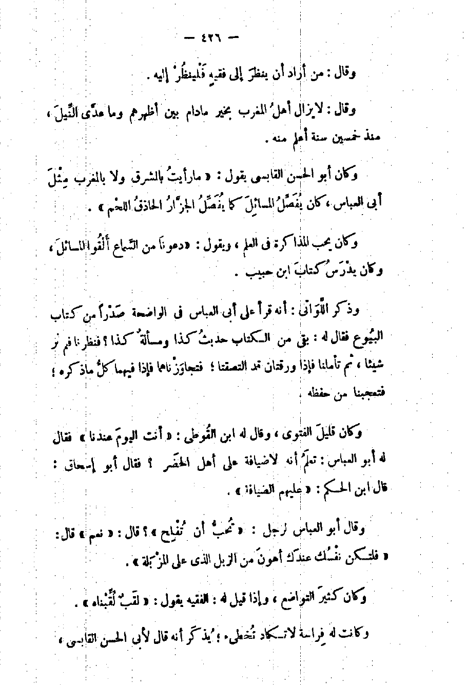 وقال من أراد أن ينظر إلى فقيه فلينظر إليه. وقال لا يزال أهل المغرب بخير ما دام بين أظهرهم وما عدى النيل منذ خمسين سنة أعلم منه. وكان أبو الحسن القابسي يقول: ما رأيت بالمشرق ولا بالمغرب مثل أبي العباس كان يفصل المسائل كما يفصل الجزار الحاذق اللحم وكان يحب المذاكرة في العلم ويقول: دعونا من السماع ألقوا المسائل وكان يدرس كتاب بن حبيب وذكر اللواتي: إنه قرأ على أبي العباس في الواضحة صدراً من كتاب البيوع فقال له: بقي من الكتاب حديث كذا ومسألة كذا؟ فنظرنا فلم نر شيئاً ثم تأملنا فإذا ورقتان قد التصقتا فتجاوزناهما فإذا فيهما كل ما ذكره فتعجبنا من حفظه. وكان قليل الفتوى وقال له بن القوطي: أنت اليوم عندنا فقال له أبو العباس: تعلم أنه لا ضيافة على أهل الحضر؟ فقال أبو إسحاق: قال بن عبد الحكم: عليهم الضيافة وقال أبو العباس لرجل: تحب أن تفلح؟ قال: نعم قال: فلتكن نفسك عندك أهون من الزبل الذي على المزبلة وكان كثير التواضع وإذا قيل له: الفقيه يقول: لقب لقبناه وكانت له فراسة لا تكاد تخطئ يذكر أنه قال لأبي الحسن القابسي