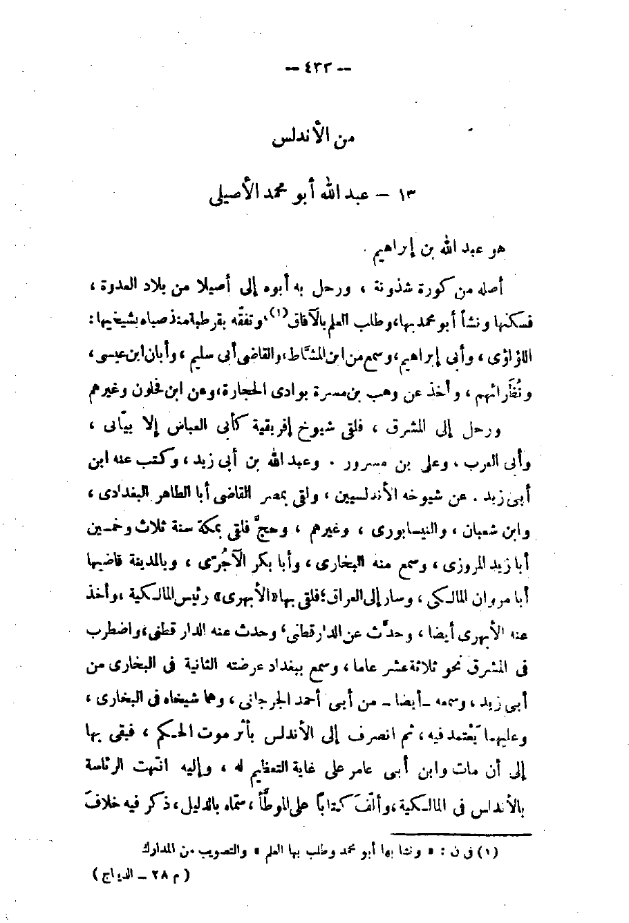 ورحل إلى المشرق فلقي شيوخ إفريقية كأبي العباس الإبياني وأبي العرب وعلي بن مسرور وعبد الله بن أبي زيد وكتب عنه بن أبي زيد عن شيوخه الأندلسيين ولقي بمصر القاضي أبا الطاهر البغدادي وابن شعبان والنيسابوري وغيرهم وحج فلقي بمكة سنة ثلاث وخمسين أبا زيد المروزي وسمع منه البخاري وأبا بكر الآجري وبالمدينة قاضيها أبا مروان المالكي وسار إلى العراق فلقي بها الأبهري رئيس المالكية وأخذ عنه الأبهري أيضاً وحدث عن الدارقطني واضطرب في المشرق نحو ثلاثة عشر عاماً وسمع ببغداد عرضته الثانية في البخاري من أبي زيد وسمعه - أيضاً - من أبي أحمد الجرجاني وهما شيخاه في البخاري وعليهما يعتمد فيه ثم انصرف إلى الأندلس بأثر موت الحكم فبقي بها إلى أن مات وابن أبي عامر على غاية التعظيم له وإليه انتهت الرئاسة بالأندلس في المالكية وألف كتاباً على الموطأ سماه بالدليل ذكر فيه خلاف