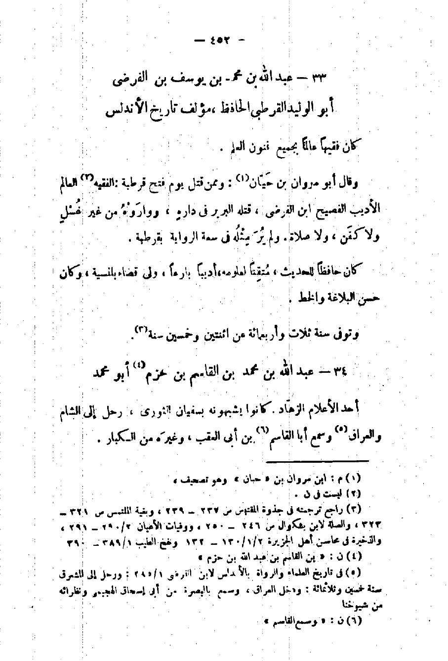 مؤلف تاريخ الأندلس كان فقيهاً عالماً بجميع فنون العلم وقال أبو مروان بن حيان: وممن قتل يوم فتح قرطبة: الفقيه العالم الأديب الفصيح بن الفرضي قتله البربر في داره وواروه من غير غسل ولا كفن ولا صلاة ولم ير مثله في سعة الرواية بقرطبة كان حافظاً للحديث متقناً لعلومه أديباً بارعاً ولي قضاء بلنسية وكان حسن البلاغة والخط. وتوفي سنة ثلاث وأربعمائة عن اثنين وخمسين سنة.