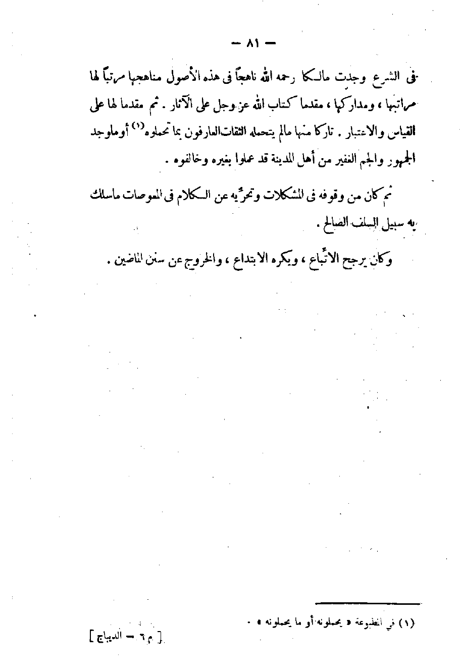 في الشرع وجدت مالكاً رحمه الله ناهجاً في هذه الأصول مناهجها مرتباً لها مراتبها ومداركها مقدماً كتاب الله عز وجل على الآثار. ثم مقدماً لها علي القياس والاعتبار. تاركاً منها ما لم يتحمله الثقات العارفون بما تحملوه أو ما وجد الجمهور والجم الغفير من أهل المدينة قد عملوا بغيره وخالفوه. ثم كان من وقوفه في المشكلات وتحريه عن الكلام في المعوصات ما سلك به سبيل السلف الصالح. وكان يرجح الاتباع ويكره الابتداع والخروج عن سنن الماضين.
